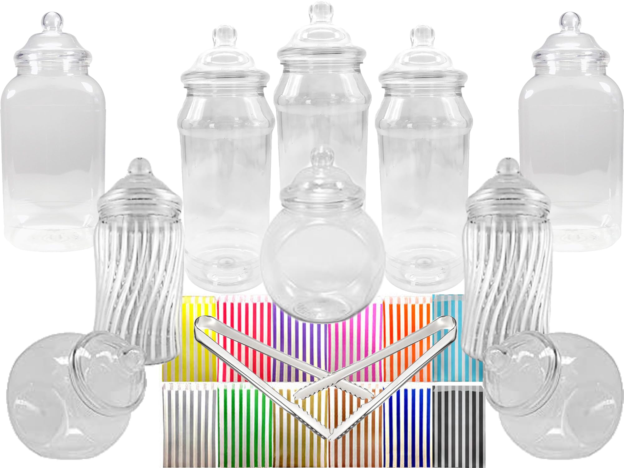 Vintage style food grade plastic sweet jars for do-it-yourself candy buffet/sweet table. Ideal for weddings, birthdays, parties, Christenings and the like. Plastic is a safer option to glass especially for children and tipsy adults! PLEASE NOTE: Sweets are not included but shown for illustration purposes only. Jars are not dishwasher safe but should be washed by hand in warm water. This kit contains the following jars: 3 x 970ml Tall Jars 2 x 995ml Square Jars 3 x 650ml Spherical Jars 2 x 450ml Spiral Jars, 2 Tongs and 50 Candy Stripe Bags (5" x 7" in size) in the colour of your choice.