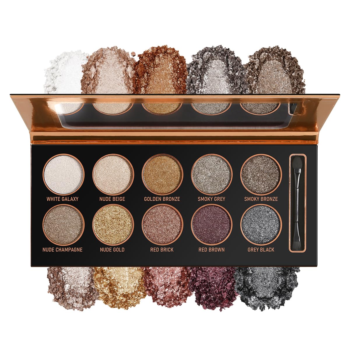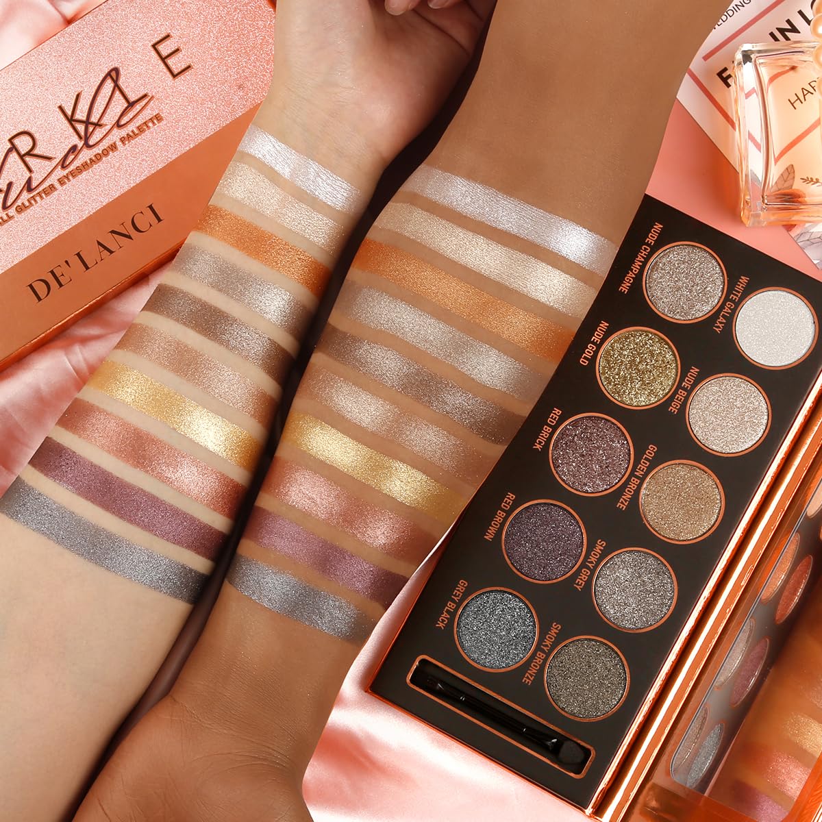 10 Color All Glitter Eyeshadow Palette, DE'LANCI Shimmer Sparkle Metallic Eye Makeup, Neutral Nude Smokey Highly Pigmented Ultra-Blendable Powder Eyeshadow, Talc Free, Hypoallergenic, Vegan