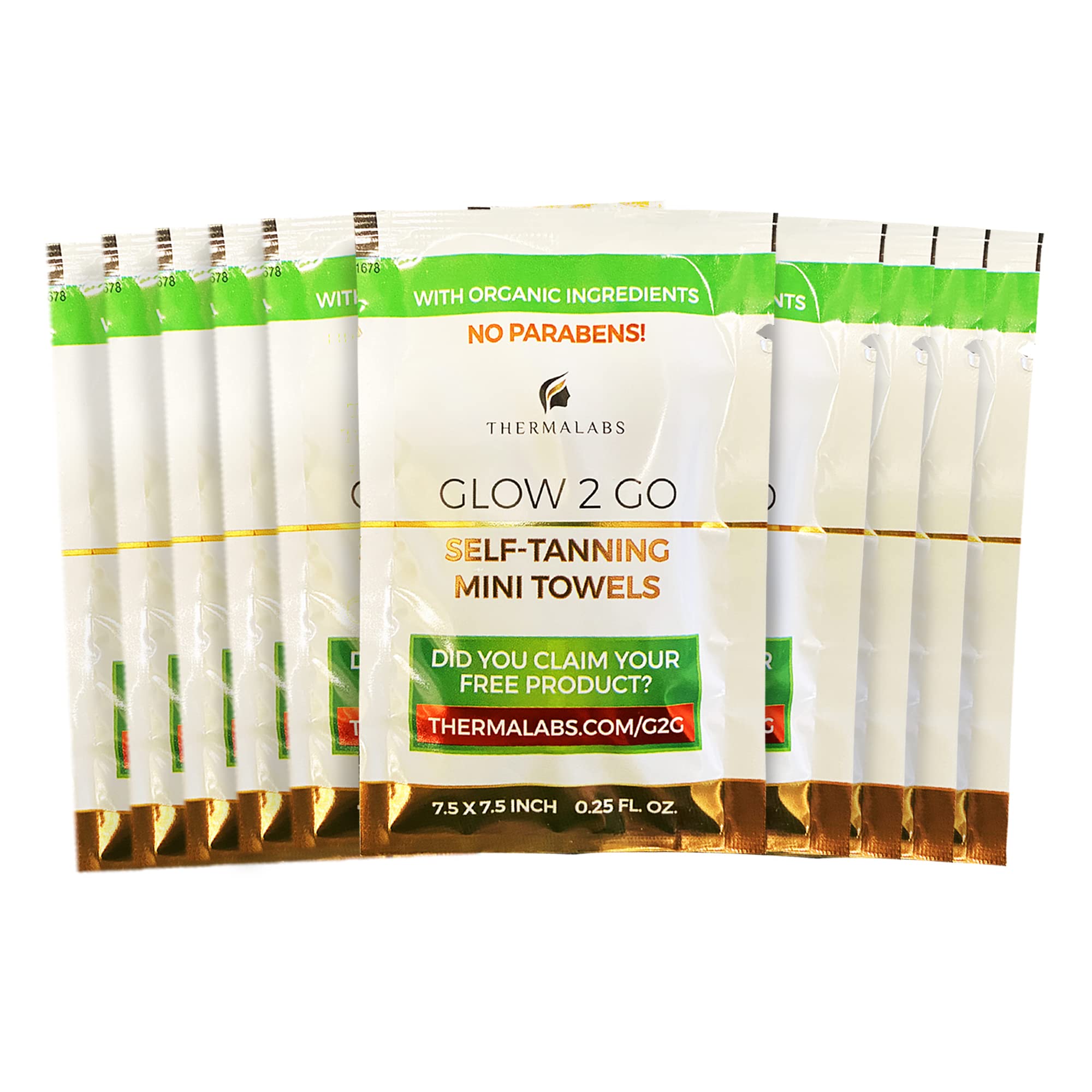 Organic self-tanners are a safer alternative to sun-based tanning and artificial tanning beds. But there are so many sunless tanners that finding the right blend for a superb faux-glow can be challenging. The Thermalabs Glow2Go disposable tanning towelettes were designed to remove the doubt out of self-tanning. Each towelette in our Super Pack is designed with healthy organic ingredients. Simply wipe the towelette on your skin and you should have a beautiful faux glow in just a few hours. Thermalabs Glow2Go towelettes make tanning easier for beginners, travelers, and anyone who does not have the time for a full-blown sunless lotion application. Made-for-you tanning towels Get the aesthetic faux glow you’re looking for with minimal effort. Read more Look Dope All Season Long! Are you stuck with a pale skin during winter? Or normal white skin while at the beach? Change the plan with Thermalabs Glow2Go. Make each day out great by hacking a glorious tan from the comfort of your home. Each tanning towelette features healthy active ingredients that induce a tan within just a few hours. What’s more, you don’t have to struggle with messy hands or spend hours on the application. Hygienic, Easy-to-Use Getting a tan doesn’t always have to be a hassle - with uneven streaks and messy hands. Glow2Go is the hygienic, easy-to-use, and completely friendly tanning towelette. Travel-Friendly Compact, travel-friendly pack of self-tanning wipes for on-the-go use. Simply stash a few in your travel bag and secure your authentic faux glow as you please. Quick Results Preparing for travel, a Saturday evening hangout with friends, or a day out at the beach? Catch your tan quick with the Thermalabs Glow2Go pack of on-the-go tanning wipes.