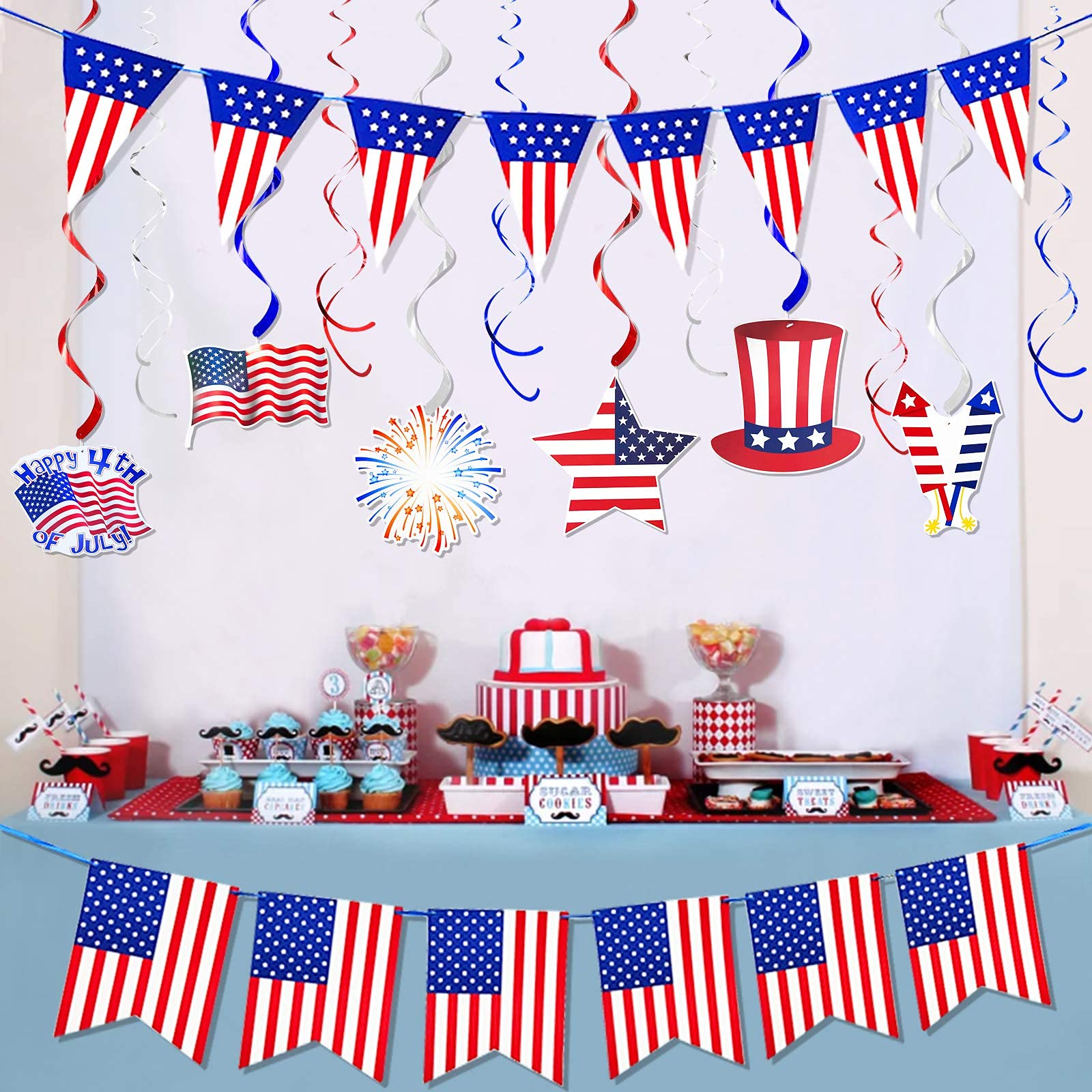14 Pack American Flag Patriotic Party Decorations, Including 12 Red White Blue Foil Hanging Swirls, and 2 USA Flag Pennant Star Banners Party Supplies for Independence Day, 4th of July, National Day, Memorial Day!Package Included:2 x Banners12 x Foil hanging swirlsSpecifications:Material: plastic, foil, cardboard.Colors: blue, white and red. Styles: American Flag, Stars and stripes. Wide Applications: ceiling, window, mantel, overhangs, doorway, archway, branches in trees, and more.Sizes:Star stripes Pennant Banner: 8.4 Ft; Each flag: 5 x 8 inch(L x W).American flag bunting banner: 6.6 Ft; Each flag: 6 x 8 inch(L x W).Hanging swirls length: folded: 5.5inch; unfolded: 27.5inch. American flag Cardboard sizes: 7 x 5inch (L x W).Fireworks Cardboard sizes: 7 x 7inch (L x W).American flag with letters cardboard sizes: 7 x 6inch (L x W).Star Cardboard sizes: 5 x 5inch(L x W).Hat Cardboard sizes: 7 x 7inch (L x W).Firework Cardboard sizes: 7 x 6inch(L x W).Suitable for: 4th of July, Memorial Day,Independence Day, President’s Day, National Day of Prayer, Armed Forces Day, Navy Day, Veterans Day, Flag Day, Constitution Day, Labor Day and more!