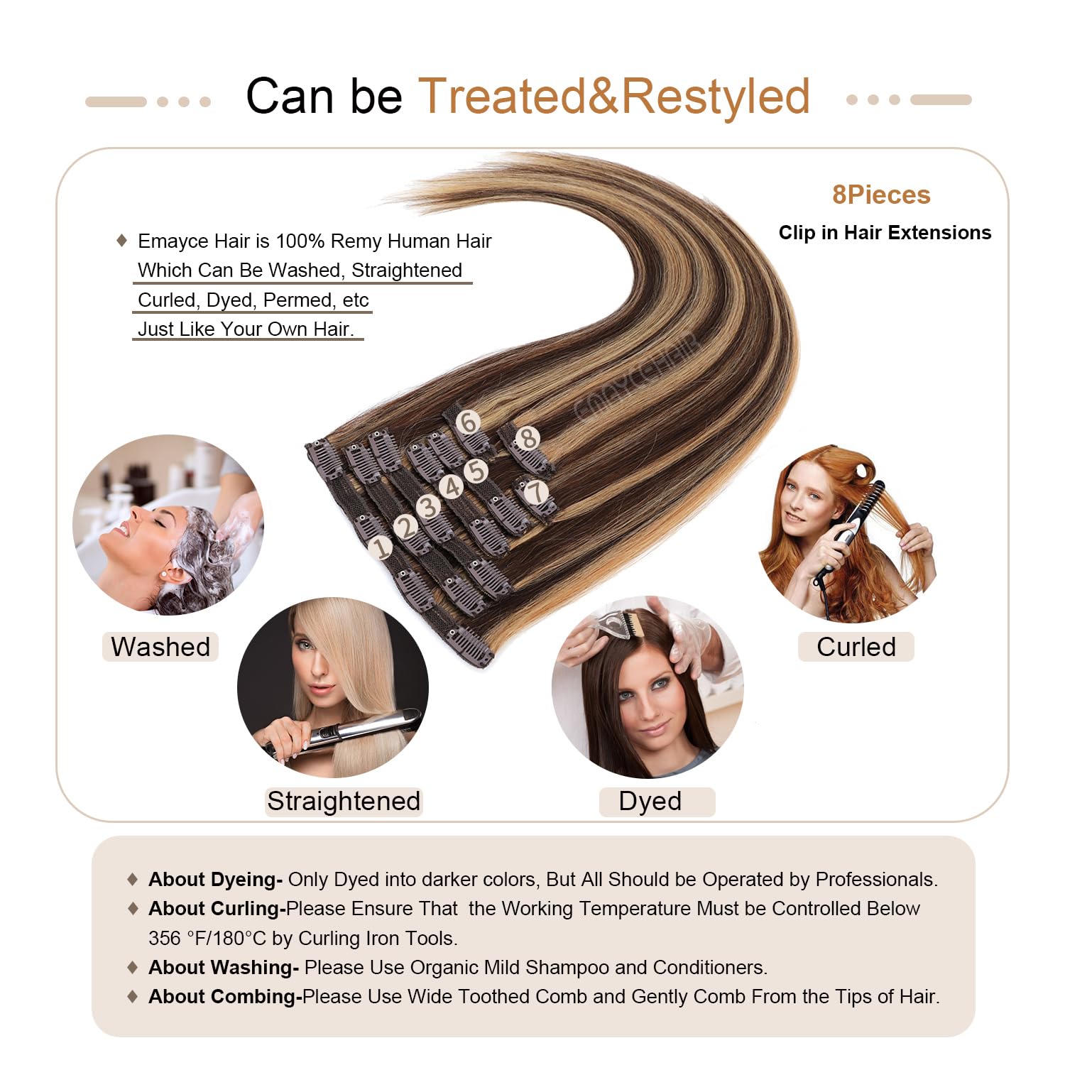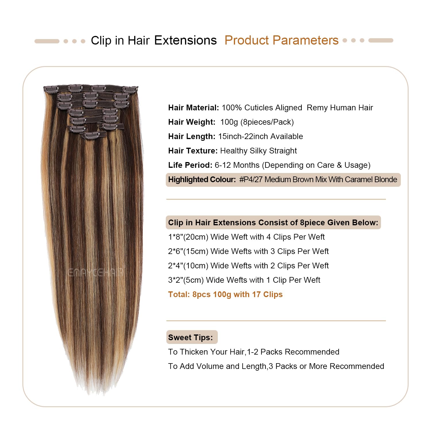 15inch Clip in Human Hair Extensions 8pcs 100g Silky Straight-100% Remy Human Hair Double Lace Weft Highlighted Color Seamless Clip in Hair Extensions for Women (15 Inch-100g, P4/27)