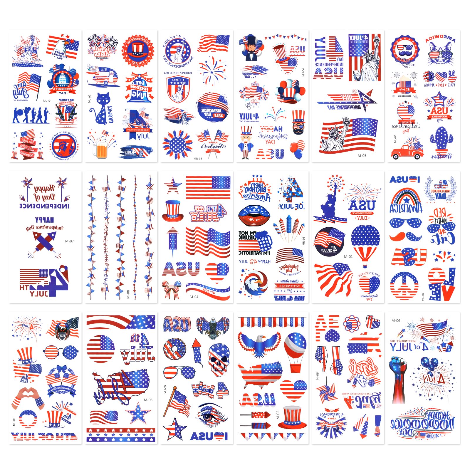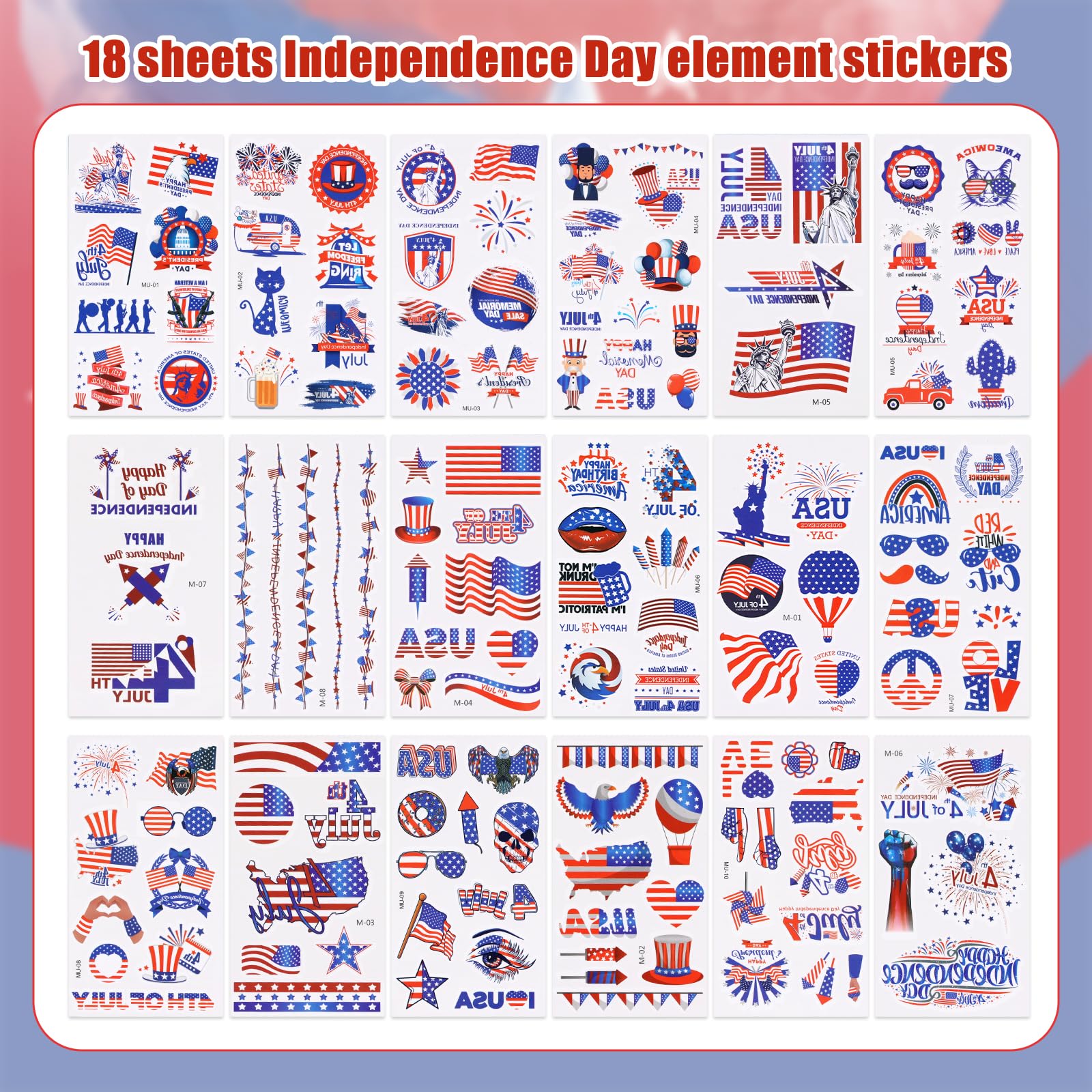 18 Sheets 4th of July Temporary Tattoos, USA Independence Day Tattoo Stickers Waterproof Fourth of July Body Art Tattoo Stickers American flag Face Tattoos for Patriotic Party Favors Supplies