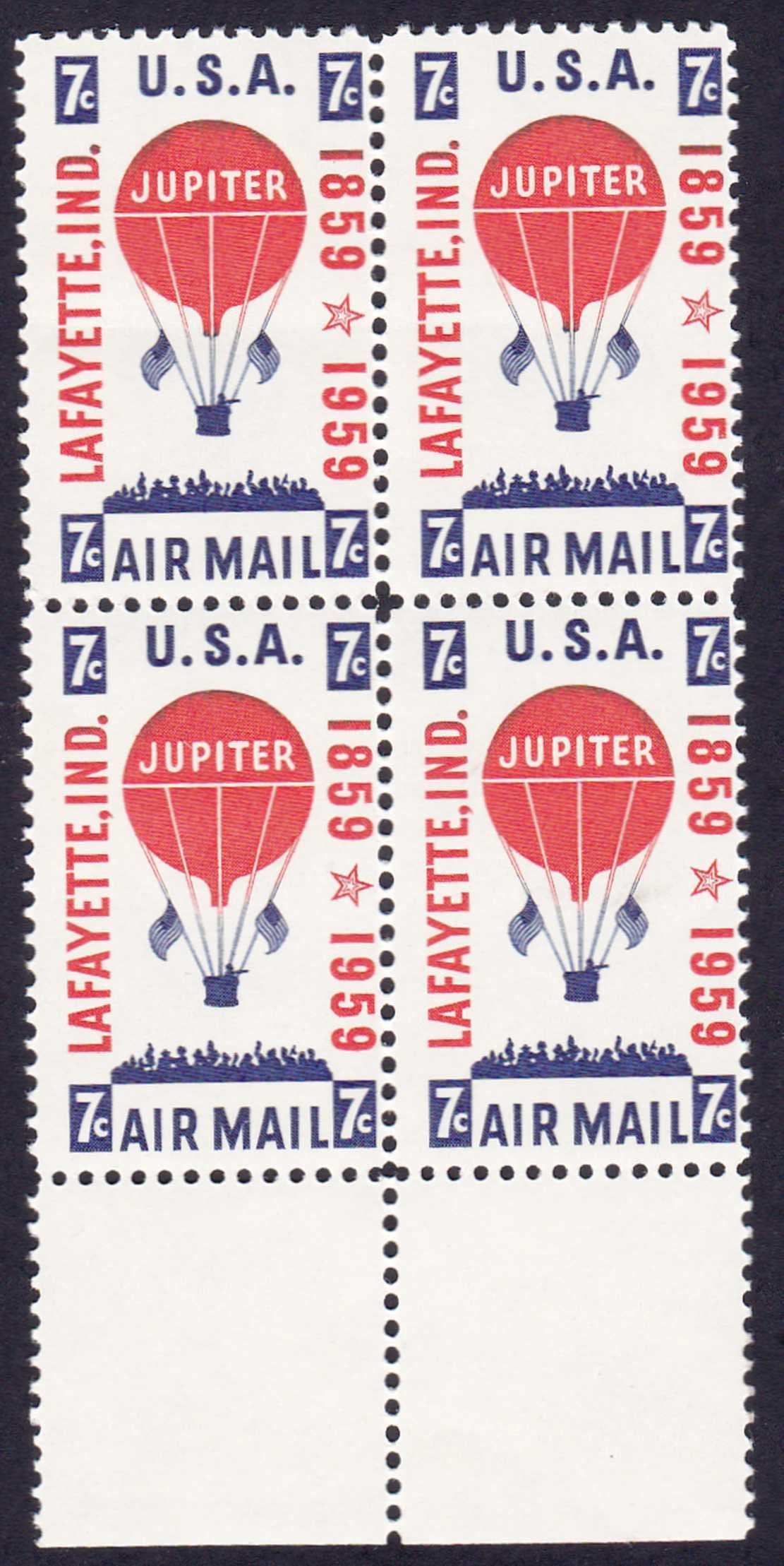 On August 17 1959 at Lafayette IN., the USPS commemorated the 100th anniversary of the first carriage of airmail in the United States on the hot-air balloon Jupiter. The balloon was flown by John Wise from Lafayette to Crawfordsville, Indiana, on August 17, 1859. There were 123 letters eventually mailed this way, and as of 1980, 23 were still know to exist.
