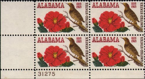 1969 Alabama Yellowhammer Flicker Camellia Plate Block of Four 6 Cent Postage Stamps Scott 1375 By USPS