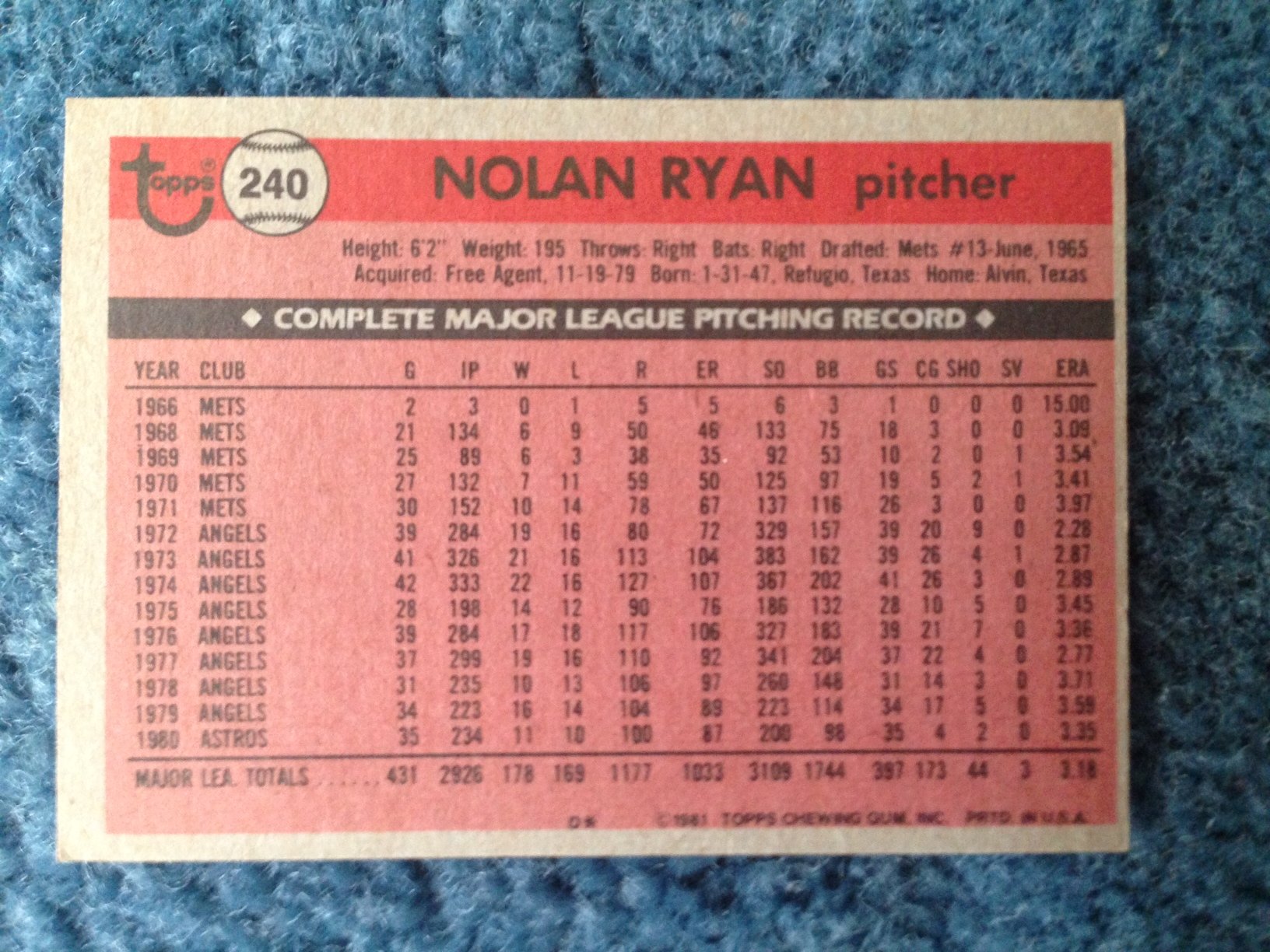 1981 Topps Nolan Ryan (Hall of Fame Pitcher) Baseball Card # 240 Houston Astros