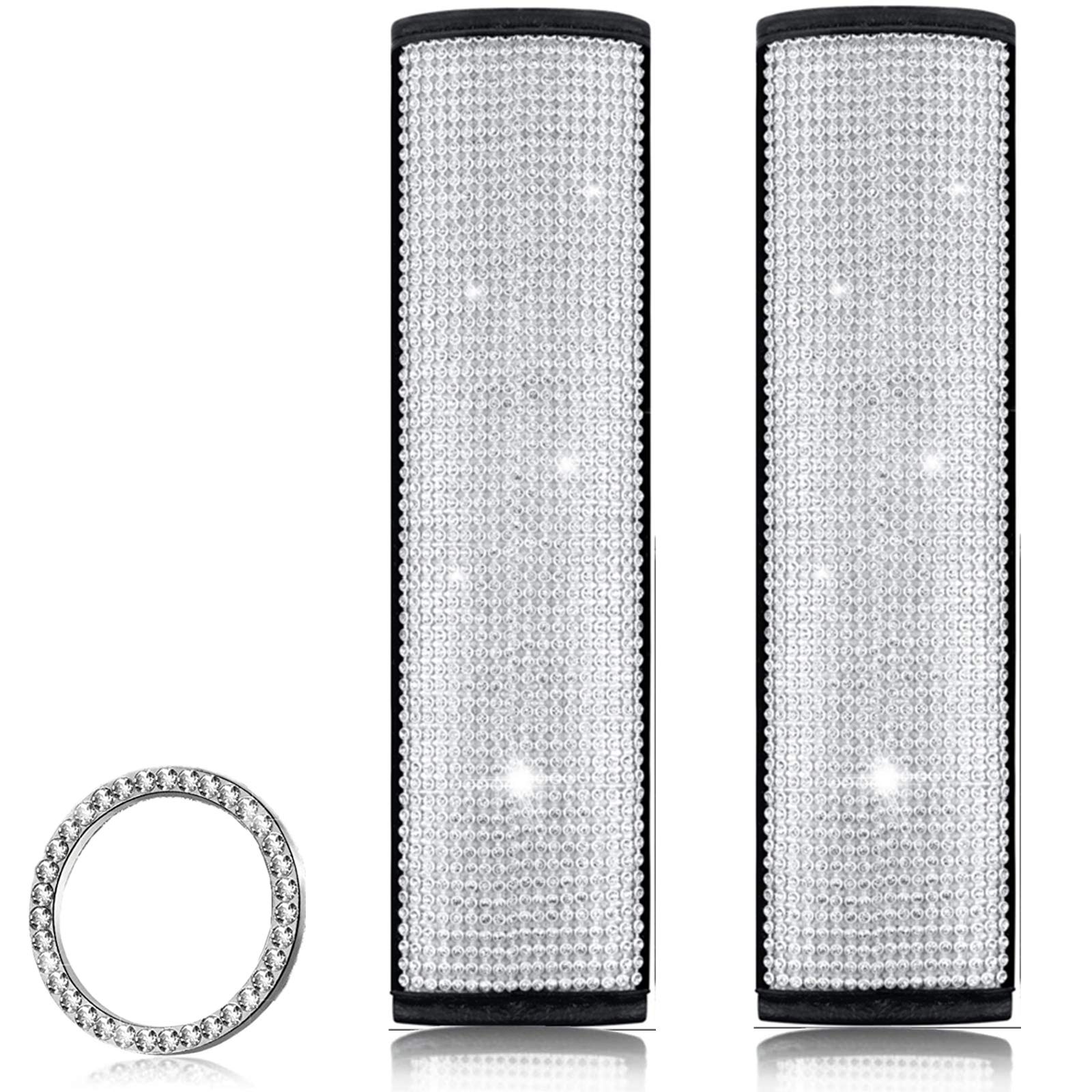 2 Packs Bling Seat Belt Cover for Women, Rhinestone Crystal Glitter Seat Belt Leather Shoulder Pads Car Decor Accessories with Start Button Ring Sticker