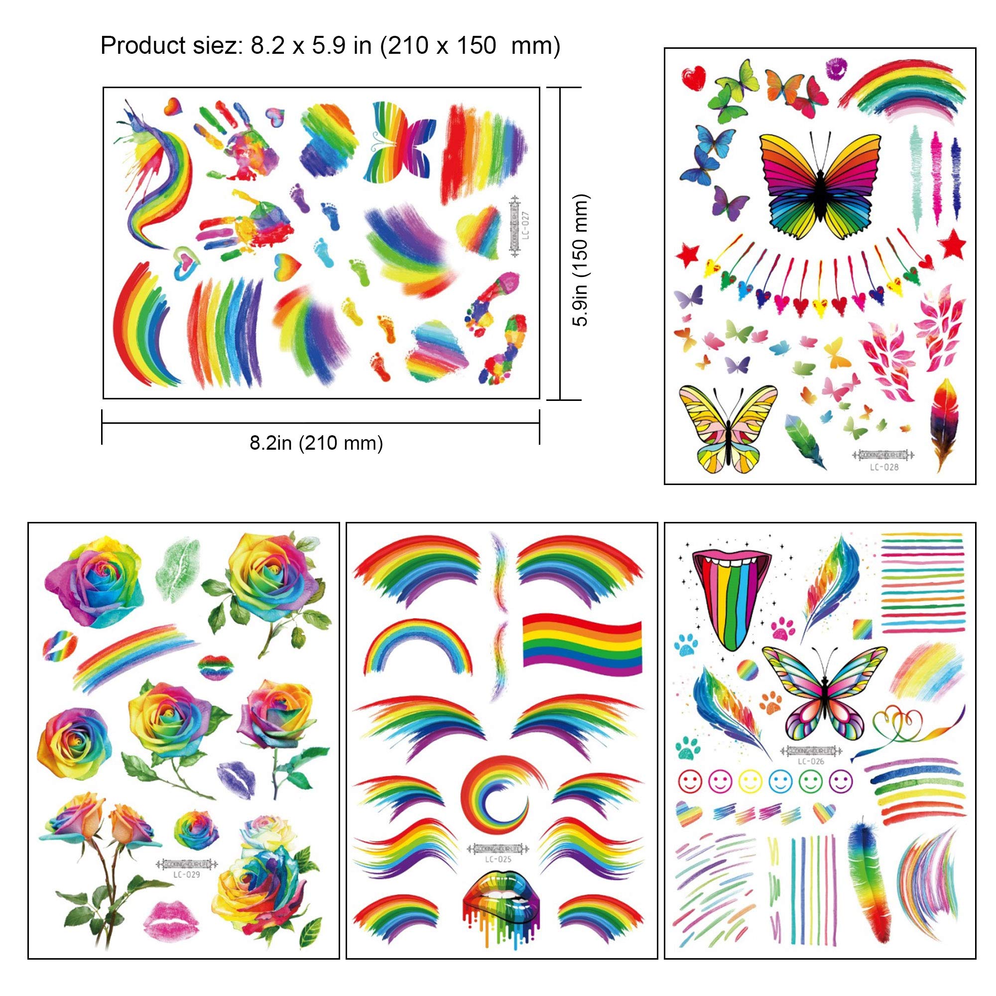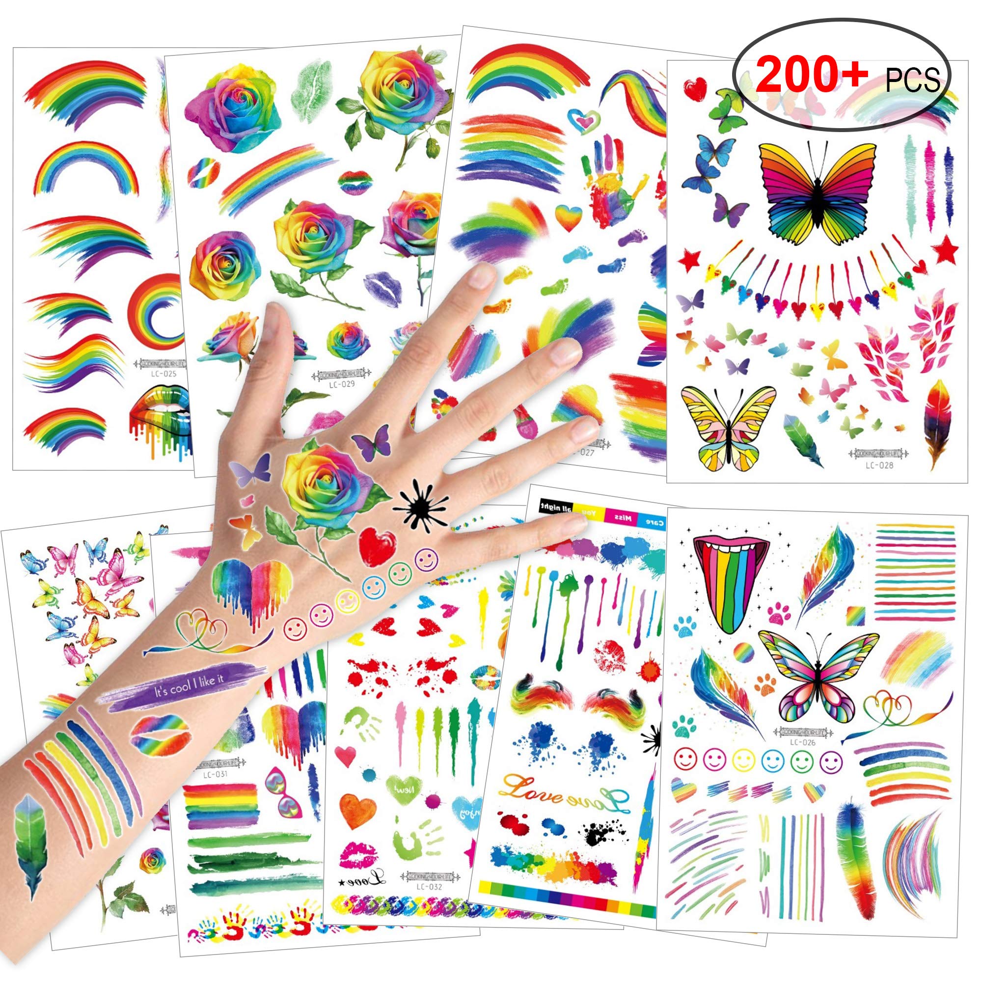 200+ Pieces Rainbow Temporary Tattoos, Konsait Butterfly/Flower/Heart/Rainbow Tattoos Waterproof Body Art Sticker for Girls Boys Birthday Party Favors Pride Equality Parades Celebrations