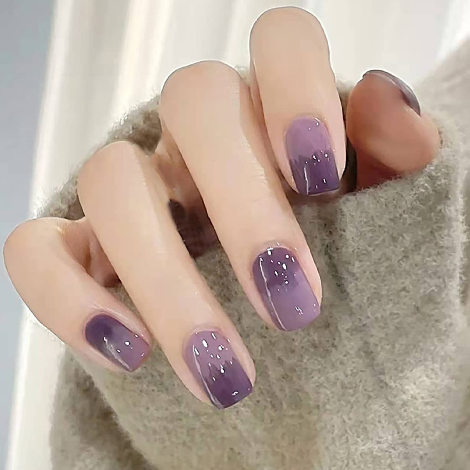 24 Pcs Press On Nails Short, Almond Glue On Nails, Full Cover Gradient Purple Square Press On Nails Art Manicure Decoration Fake Nails Acrylic Nails for Women And Girls