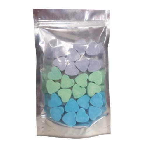 24 x mini bath hearts in a resealable silver gift pouch in jasmine, passion fruit and seakay scents (8 of each supplied)