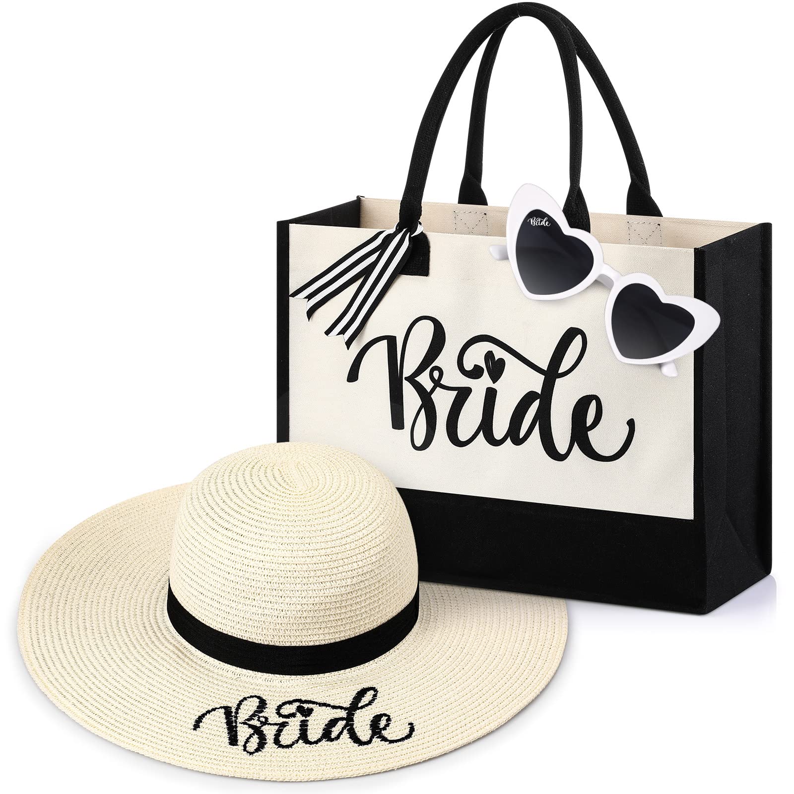 3 Pieces Bride Tote Bag Beach Hat Glasses Set Including Canvas Tote Bag for Bride 16.5 x 11.8 Inch Wedding Bride Floppy Brim Beach Hat 15.8 Inch Love Heart Shape Sunglasses Bachlorette Gift for Bride