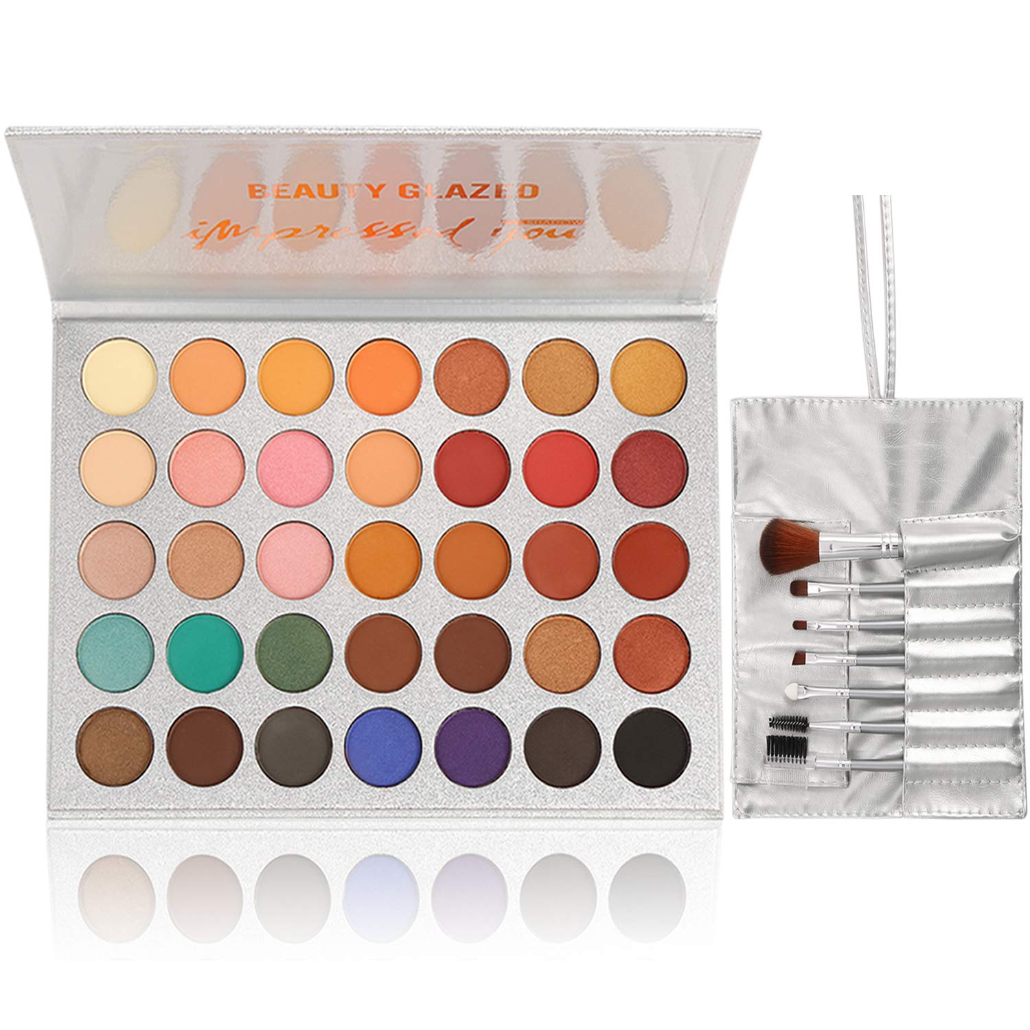 Eyeshadows Palette Features: 1.Glossy color and nourish ingredients together to care eye skin around.High quality ingredients with shine color, can last for all day long!Feel light and soft easily create clear and brilliant eye makeup finish. 2.Very pigmented and vibrant, palettes includes matte and shimmer eyeshadows, easy to match your look!The pearlescent matte eye shadows will make you attractive in the evening.Wonderful warm color palette eye shadow sets prefer for professional smoky eyes makeup, wedding makeup, party makeup or casual makeup. 3.No dye and will not form a annoying eye shadow mark Ingredients: Talc, Mica, Mineral Oil, Phenyl Trimethicone, Kaolin, Titanium Dioxide, Magnesium Stearate, Isopropyl palmitate, Polymethyl,Methacrylate,Lanolin,Methylparaben, and Propylparaben. Package Included: 35 colors Eyeshadow Palette 7 pieces makeup brushes set