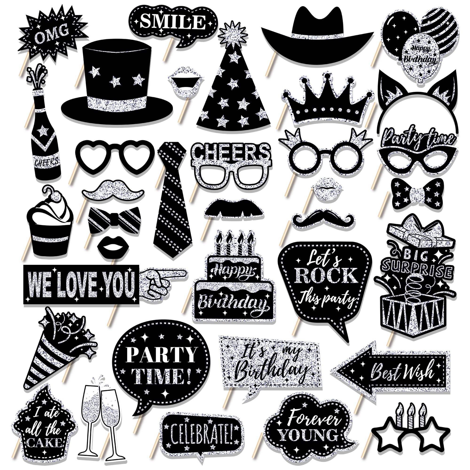 36 Silver Birthday Photo Booth, Party Photo Booth Props Photo Booth Props Photo Box Accessories with Hat Crowns for Birthday Wedding Graduation Christmas New Year's Eve Party Accessories