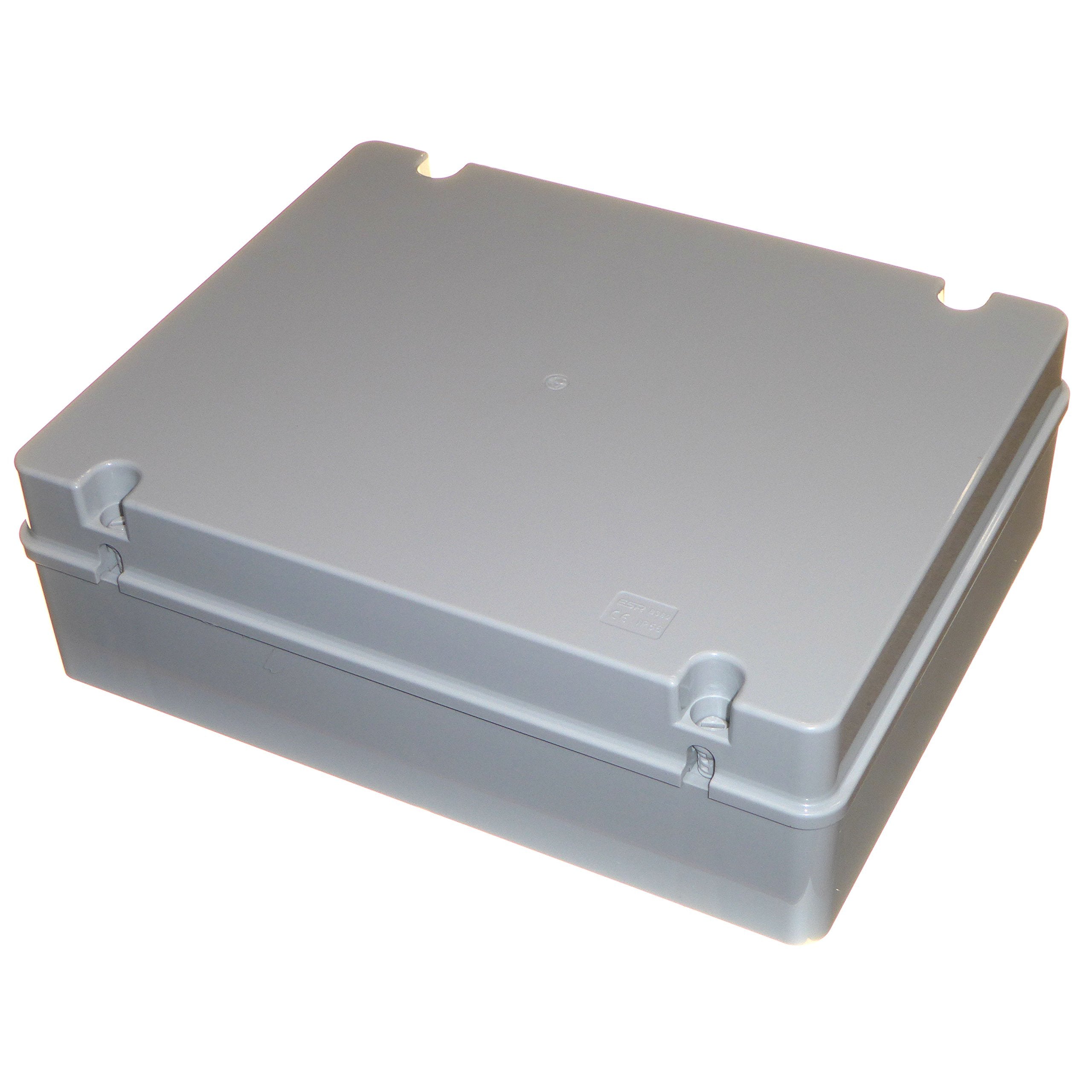 1 x Large Weatherproof Box which can be used as a standard junction box to house cable connections or as an adaptable enclosure to house various system controls, sockets, switches, pilot lights etc. Made from halogen-free plastic, finished in grey, internal ribbing to ensure the box keeps it's shape and stays sturdy. The box has plain sides (no knockouts) allowing the user to drill holes wherever required. The screws that secure the lid are made from plastic meaning there are no rustable parts on the box. if 2 screws are left partially screwed in on one side, they will create a hinge allowing user to open and close the lid. IP56 rated so is suitable for indoor and outdoor use. Internal dimensions are 380 x 300 x 120mm, the actual box is 400 x 320 x 130mm