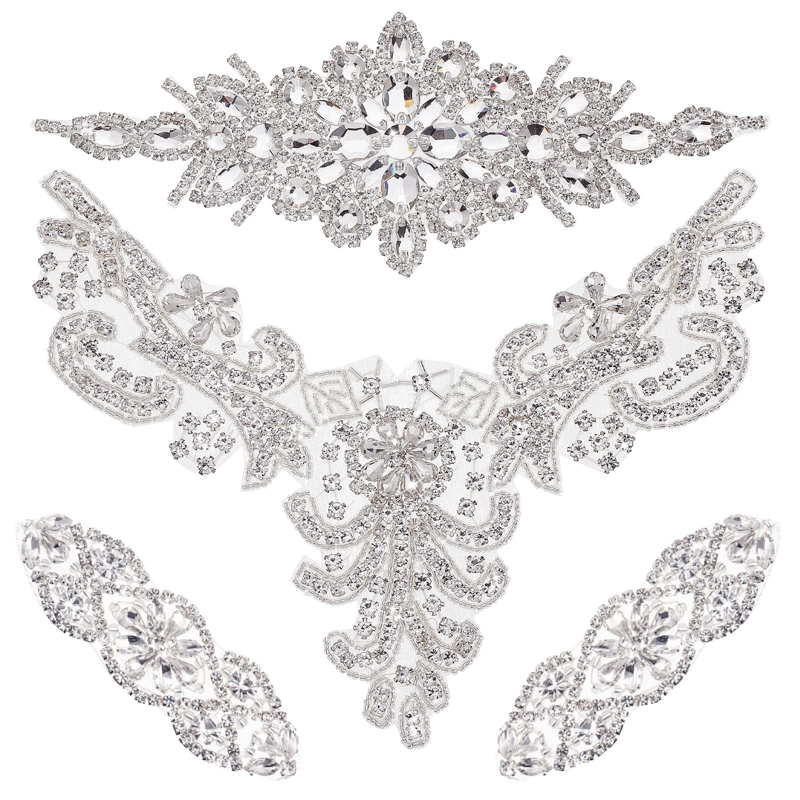4 Pieces Crystal Rhinestone Applique Silver Bridal Wedding Applique Iron on Rhinestone Bridal Sash Applique for Women Prom Clothes Wedding Dress Belt Decoration Headpieces