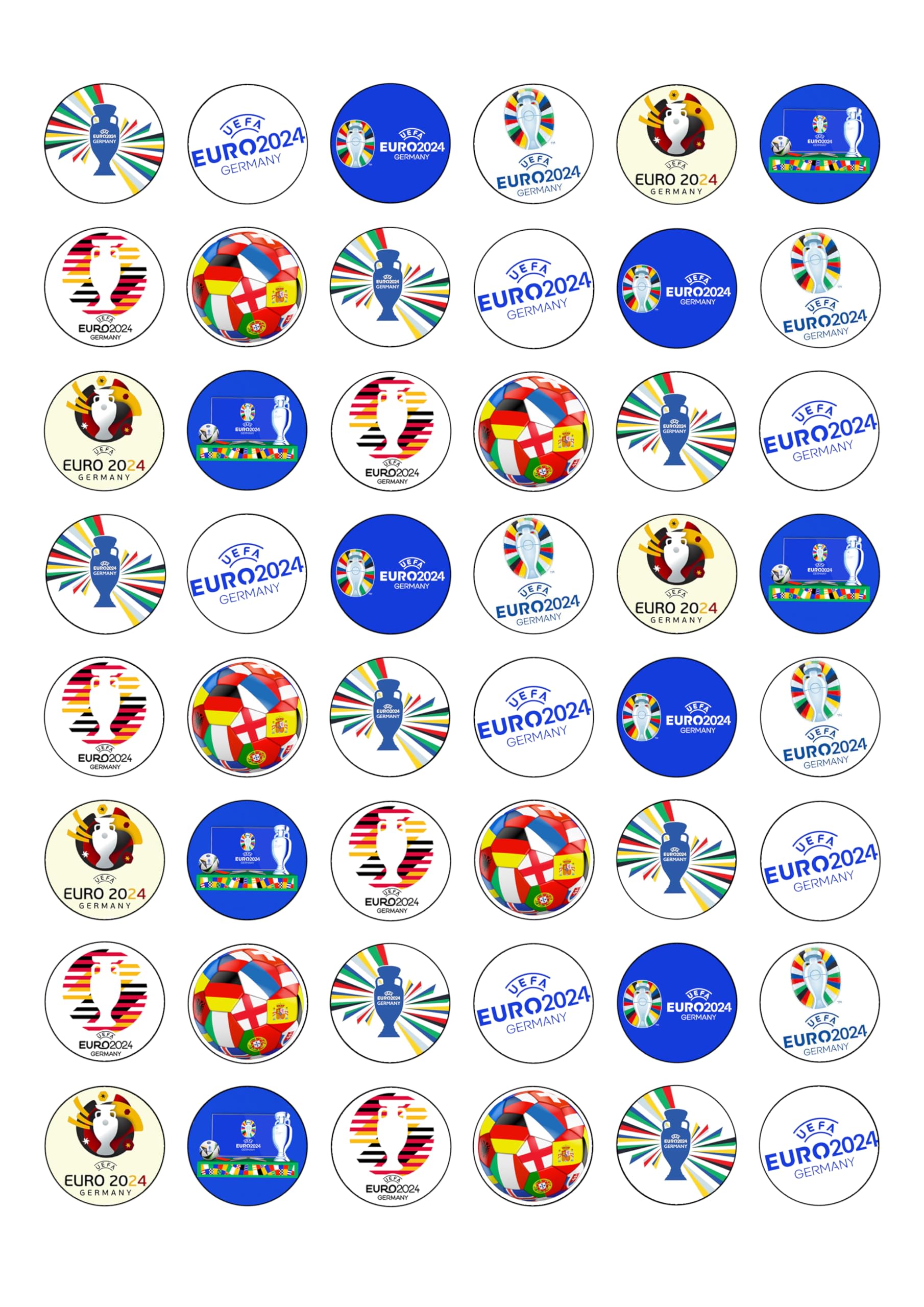 You will receive an A4 sheet with 48 x 2.5cm circle Football 2024 Euros Germany themed toppers. All printed with edible ink on wafer paper. REQUIRES CUTTING OUT. Once cut, push them into buttercream on your cupcakes/cake.