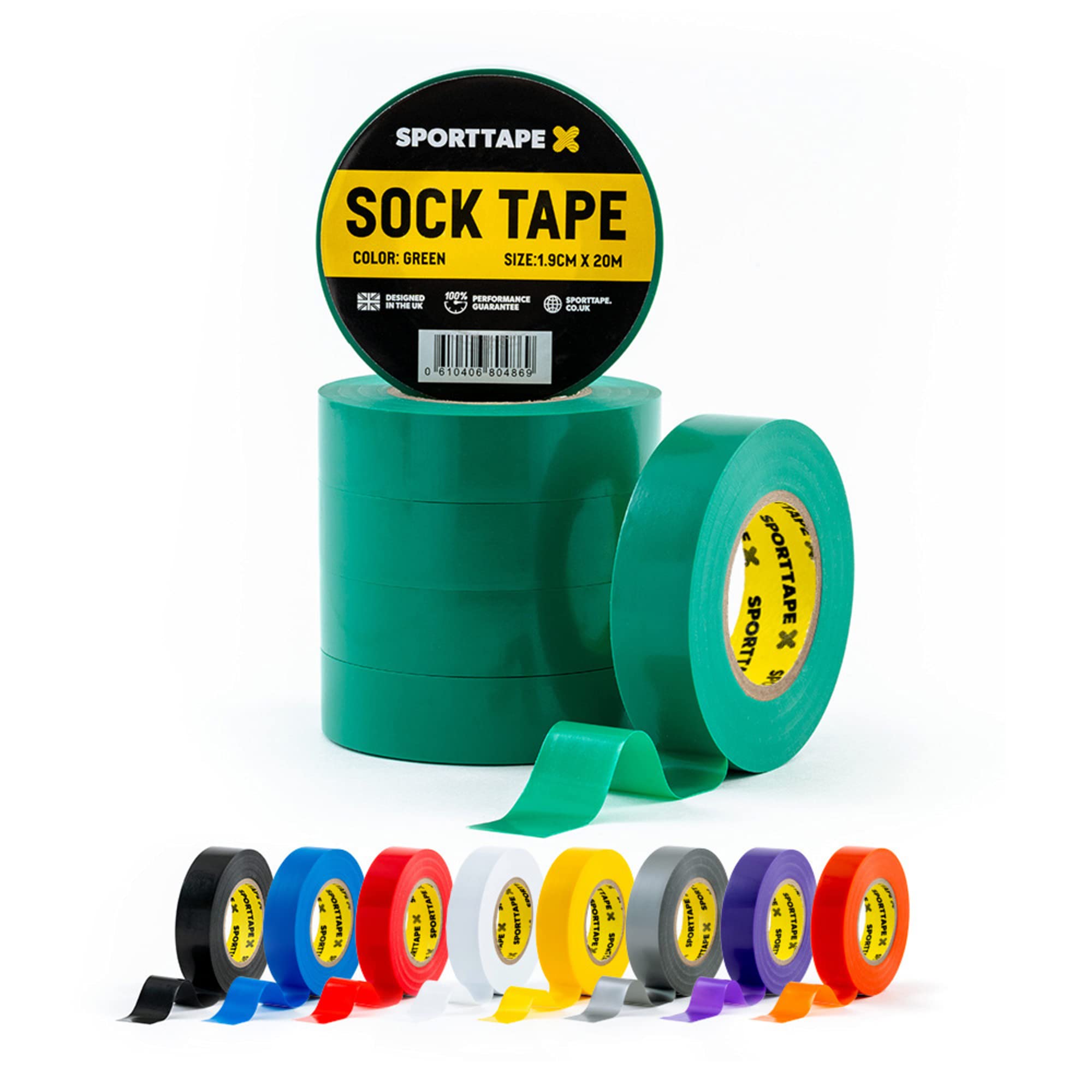 SPORTTAPE 6 Rolls Sock Tape - Green - 1.9cm x 20m | PVC Football, Soccer & Rugby Boot Tape - Best for Keeping Up Socks, Shin Pads, Shin Guard Tape | Securing Lifting Blocks & Ear Tape