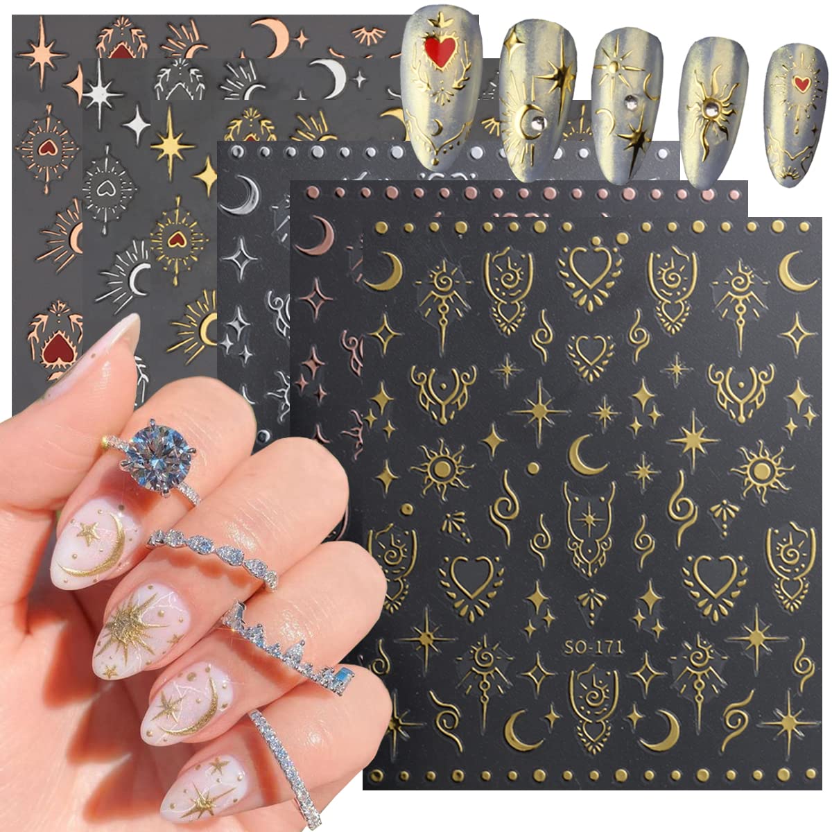 6 Sheets Metallic Nail Art Stickers Star Moon Nail Decals 3D Self-Adhesive Nail Art Supplies Sun Stars Heart Retro Rose Gold Sliver Starlight Glitter Nail Design Sticker for Women DIY Nail Decorations