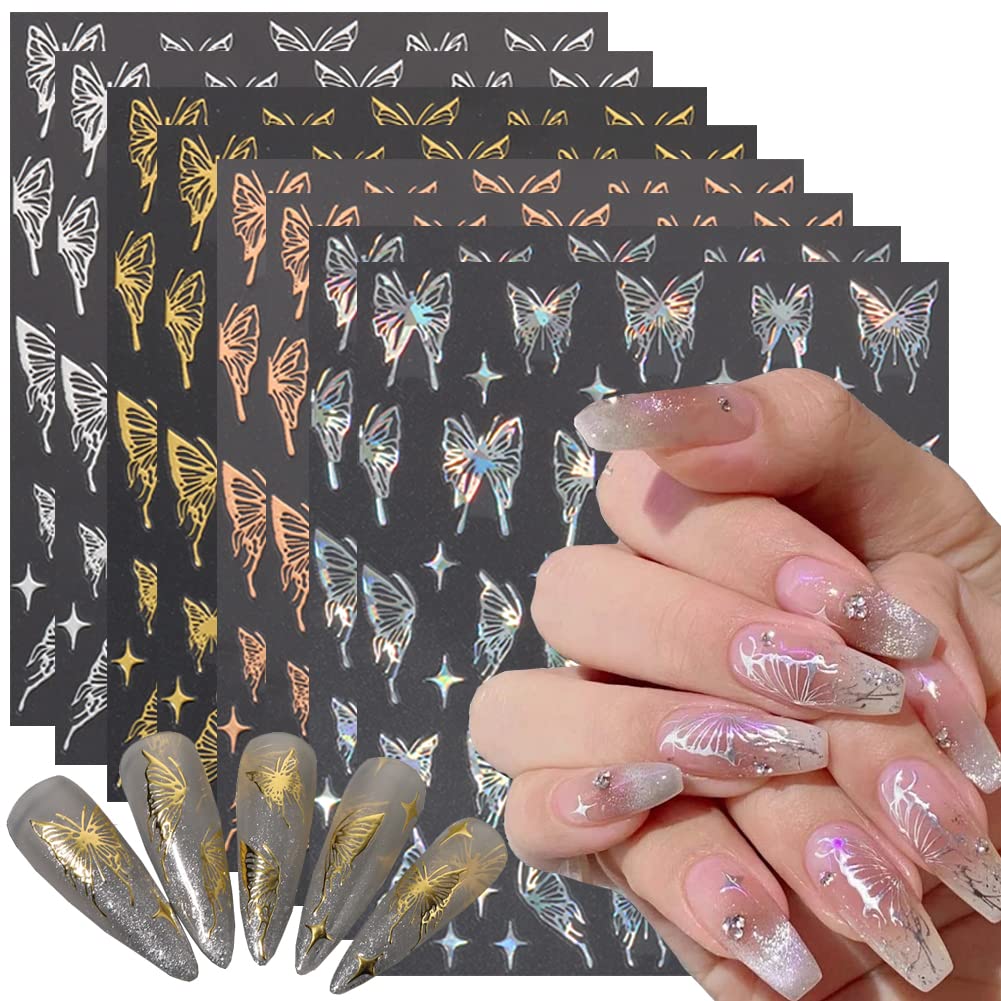 8 Sheets Butterfly Nails Art Stickers,Gold Nail Decals 3D Self-Adhesive Nail Art Supplies Holographic Laser Butterflies Stars Nail Design Luxurious Bronzing DIY Nail Charm Nail Decorations for Women