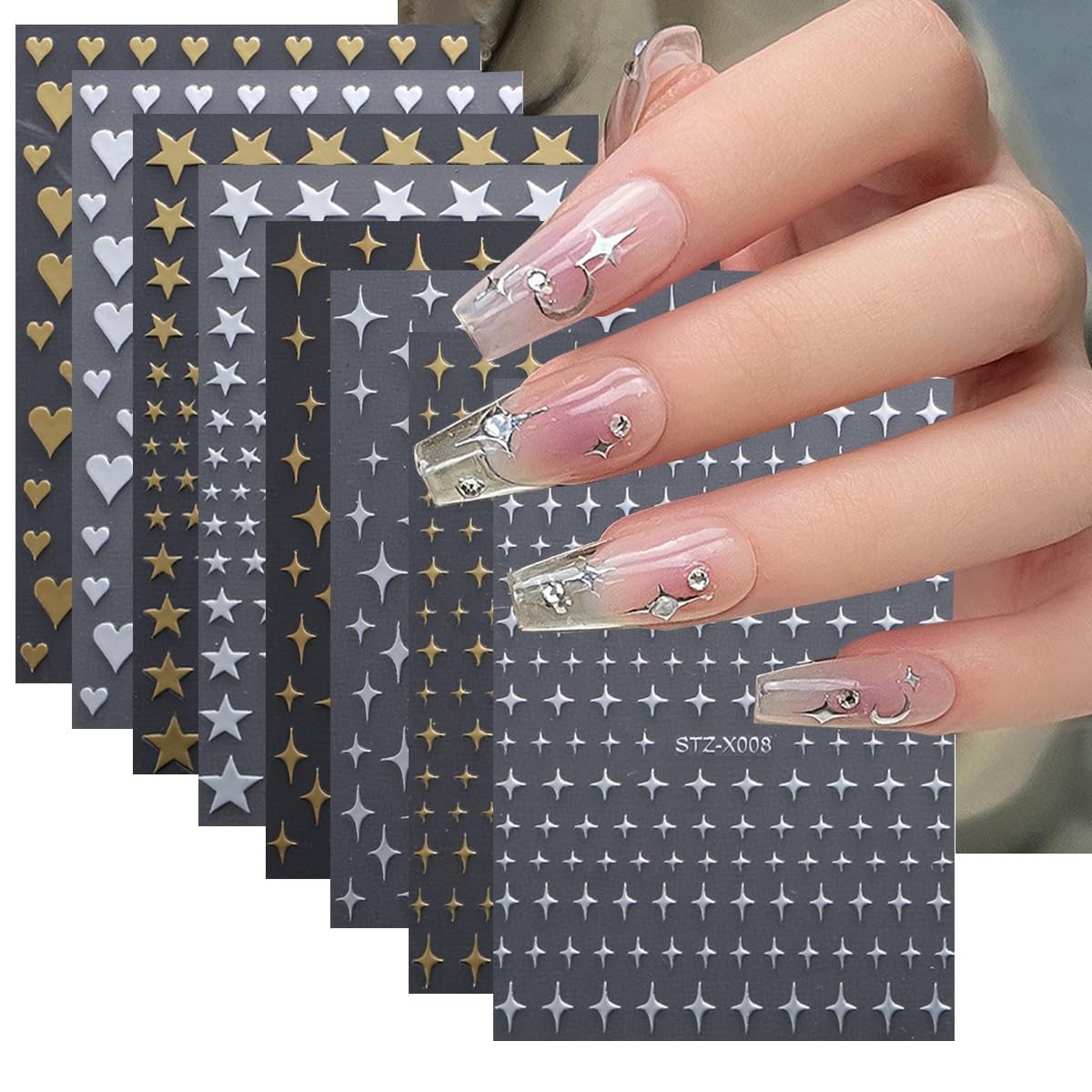 8 Sheets Metallic Nail Art Stickers Heart Nail Decals 3D Self-Adhesive Nail Art Supplies Luxury Heart Stars Gold Silver Nail Designs Stickers for Nail Decorations Manicure Accessories
