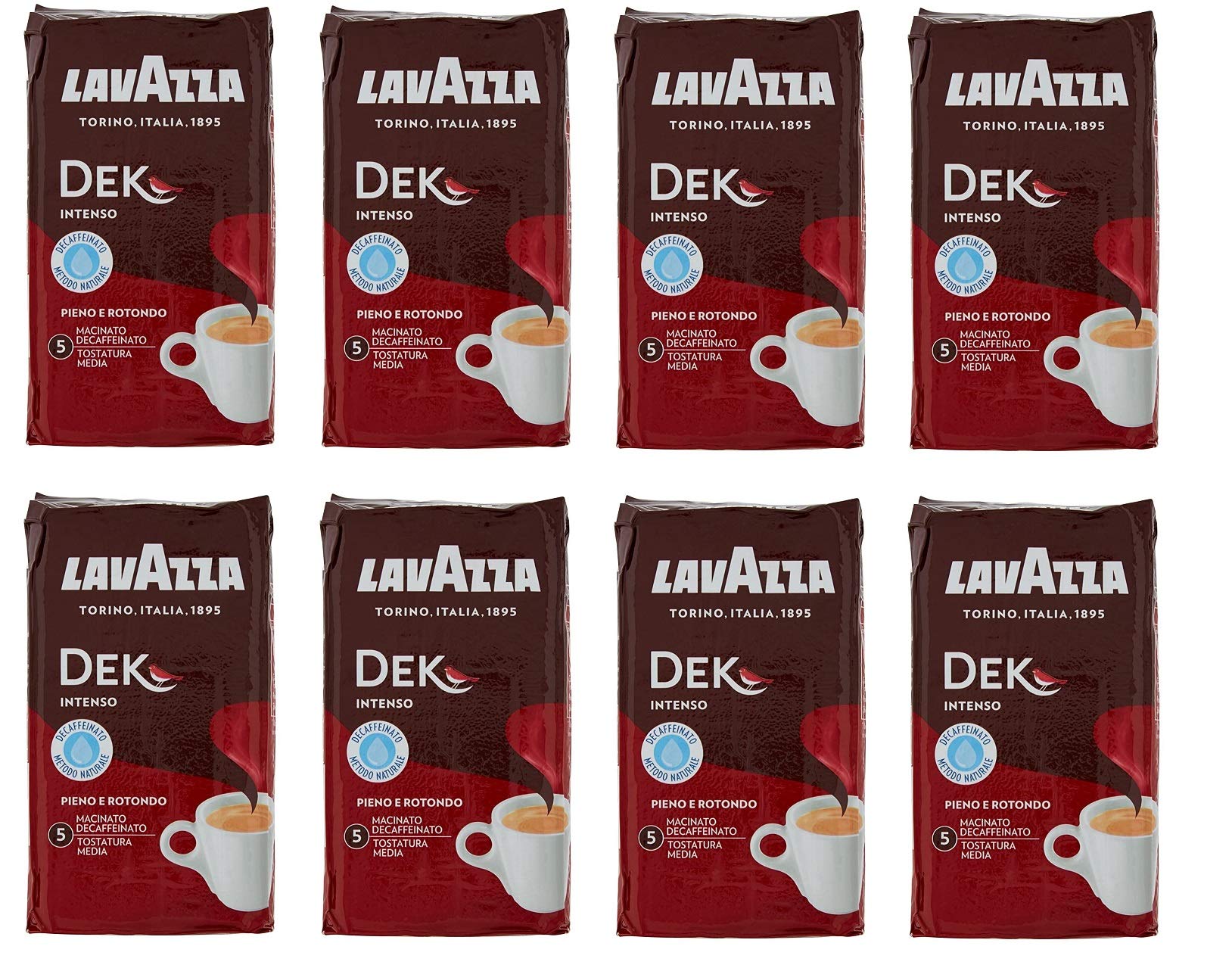 8 x 500g pack, of ground Lavazza Dek coffee medium roasting, a delicate taste and a level 5 intensity A blend of Robusta and Arabica beans with a smooth flavour and hints of Wood and Tobacco. This decaffeinated coffee can be used with a moka pot, filtered coffee machines or a French press 8 x 250g vacuum packed coffee Lavazza Dek offers the pleasure of good coffee that Italian families love Store in a cool and dry place for long-lasting freshness Safely packaged in a soft pack made of recyclable material.