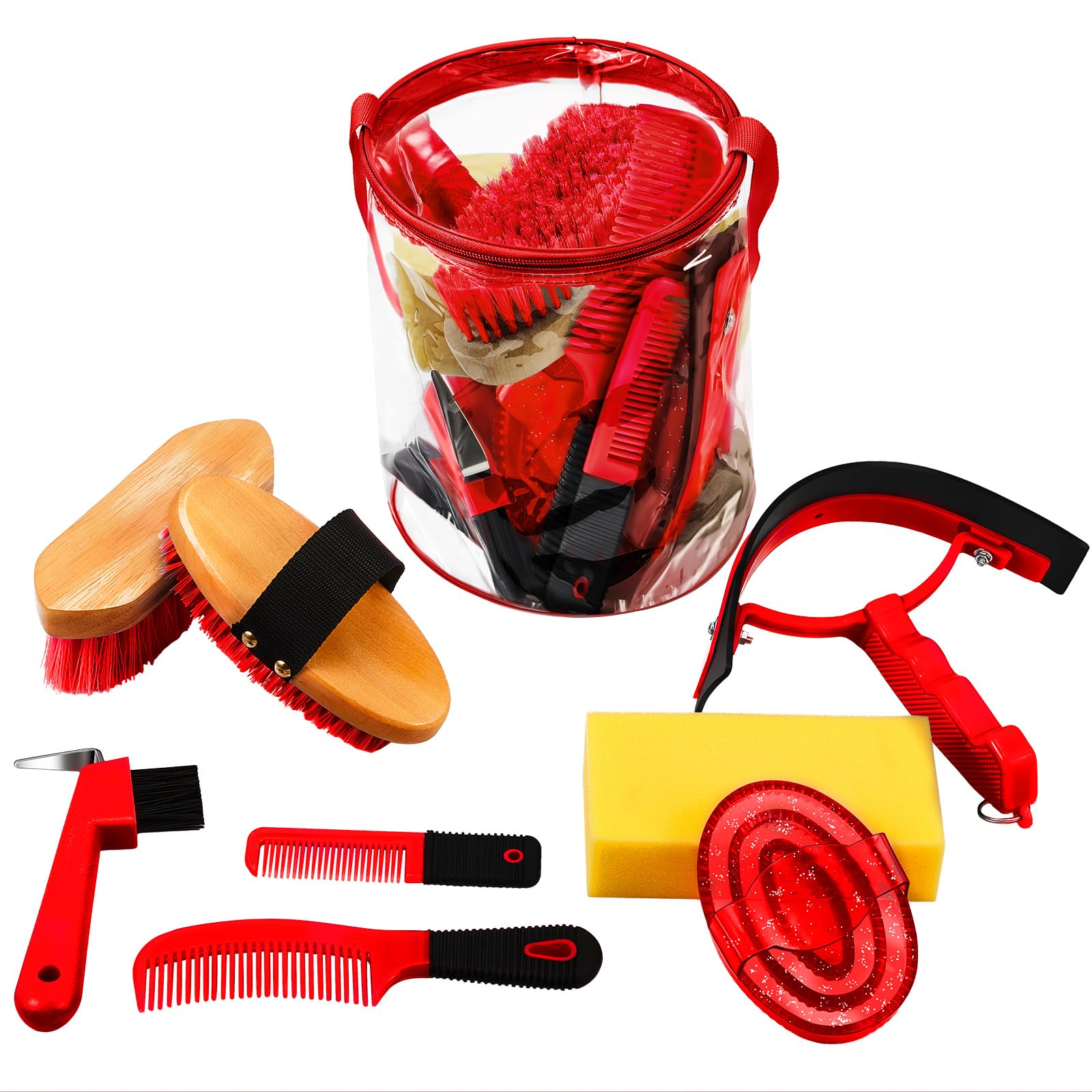 9 Pieces Horse Grooming Kit Tack Room Supplies Set with Organizer Tote Bag, Oval Massage Curry, Hard and Soft Brush, Hoof Pick, Sweat Scraper, Bathing Sponge, Combs for Horse Riders Beginners (Red)