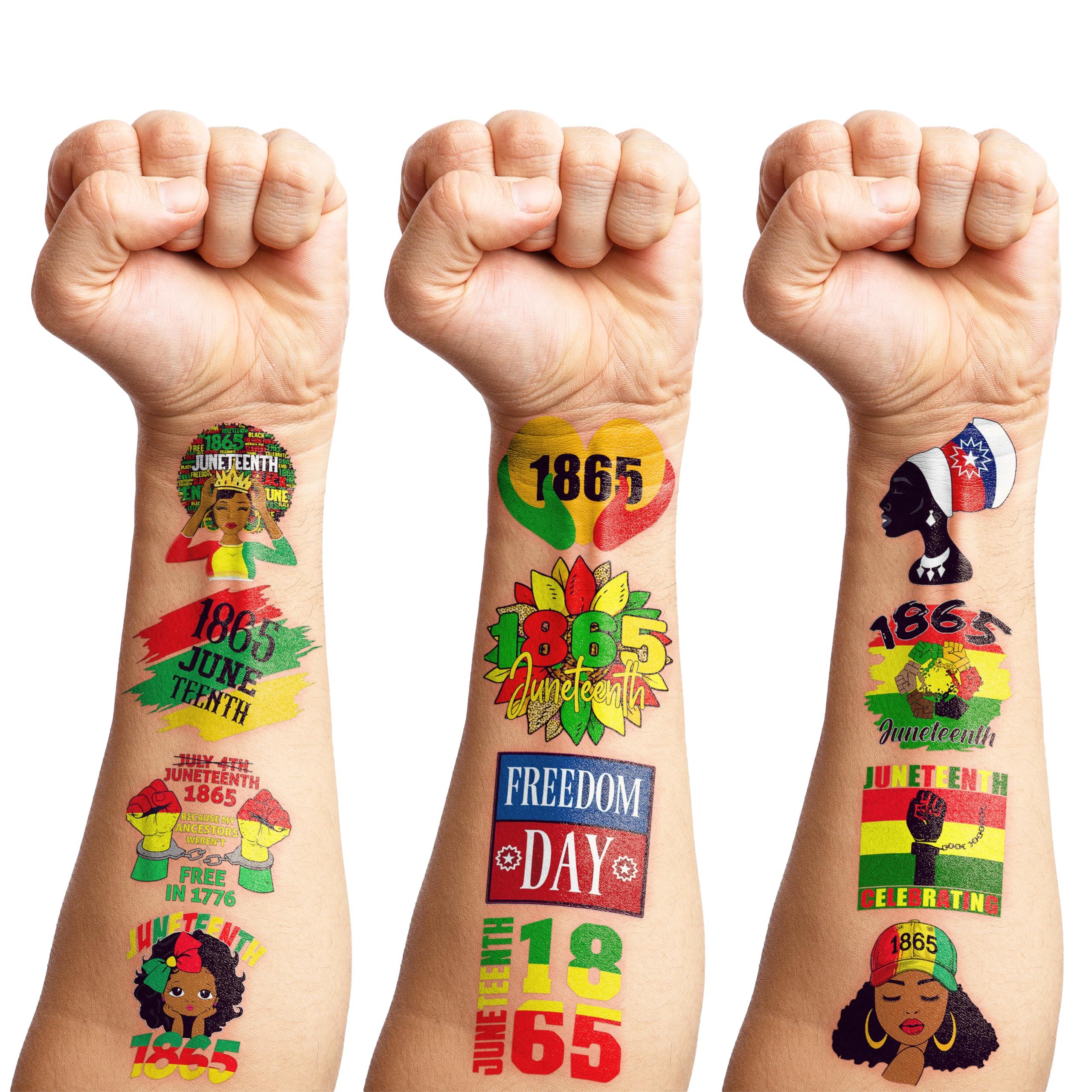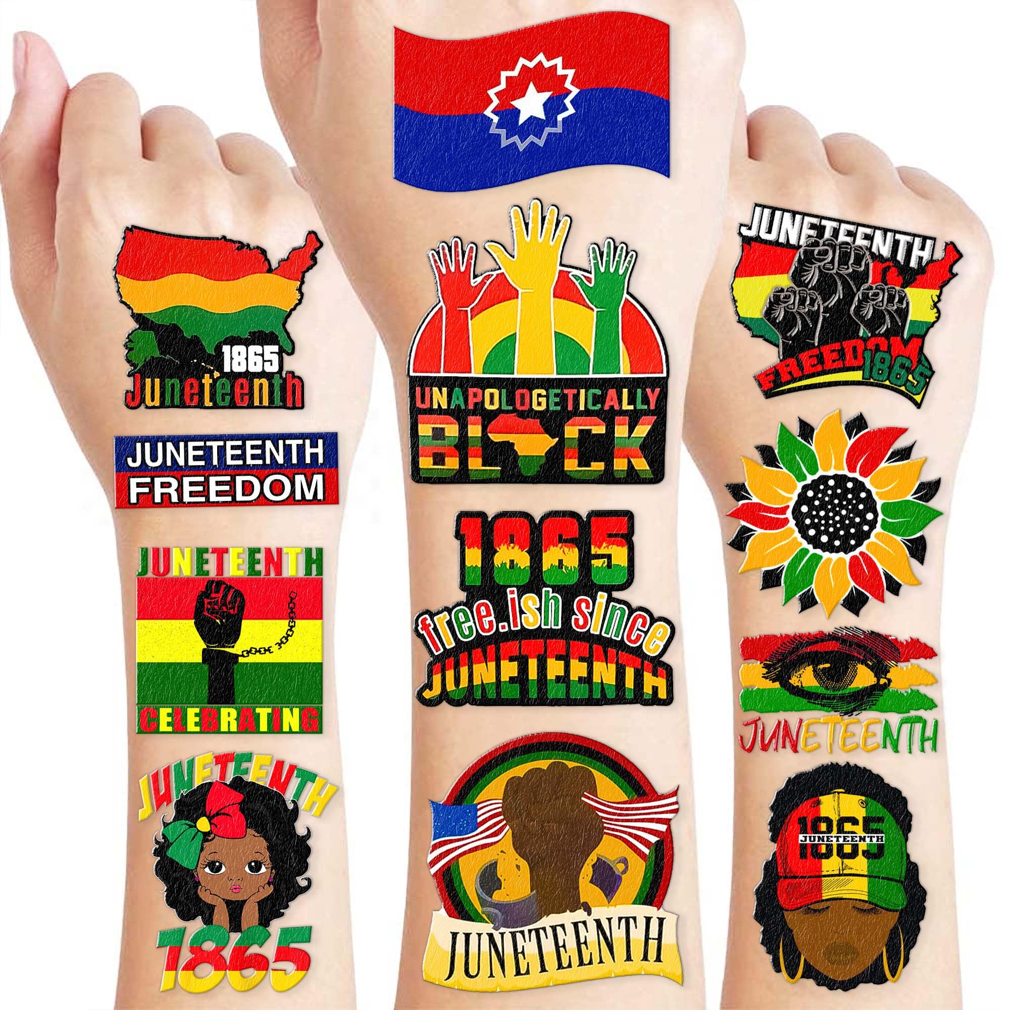 ??PACKAGE INCLUDES: The package includes 10 sheets, each with 96 PCS and measures 6.1 x 3.1 inches, as well as a full set of JUNETEENTH tattoos. This amazing ornament assortment is sure to exceed your expectations. ??UNIQUE DESIGNS: You'll get JUNETEENTH tattoos including American flag, African map, hand, broken chain, Afro American lady, colorful flag, sunflowers, and "Happy JUNETEENTH Independence Day" words. The colorful designs will make your celebration memorable. ??APPLICABLE OCCASIONS: The Freedom Day tattoos are wonderful for Juneteenth festival party, African American Independence Day, family parties, African American home birthday parties, or other festivals and celebrations; nice party decorations and party supplies, provide you amazing experiences. ??SAFE AND HIGH QUALITY: We create temporary tattoos using high-quality, eco-friendly paper that is safe to use. Our tattoos are visually appealing and made with utmost care for our clients' safety. ??HOW TO APPLY: Firstly, cut out the pattern and peel off protective film. Secondly, place the tattoo on to skin or objects like a water bottle, purse, laptop,phone case,etc. Next, wet the paper until it soaked.Then, light pressure tattoo on the paper for 10 seconds.Finally, remove the tattoo paper it's done. Go ahead and enjoy your stunning new look! And You'll have a gorgeous, velvety tattoo that can be easily removed with baby oil, soap, or water. ??THINGS TO NOTES: Do not apply around eyes, lip or sensitive skin area.Under no circumstances should anyone under the age of four use this without adult supervision. Our team is always here to help and make sure you have a positive shopping experience. Please do not hesitate to contact us for assistance.
