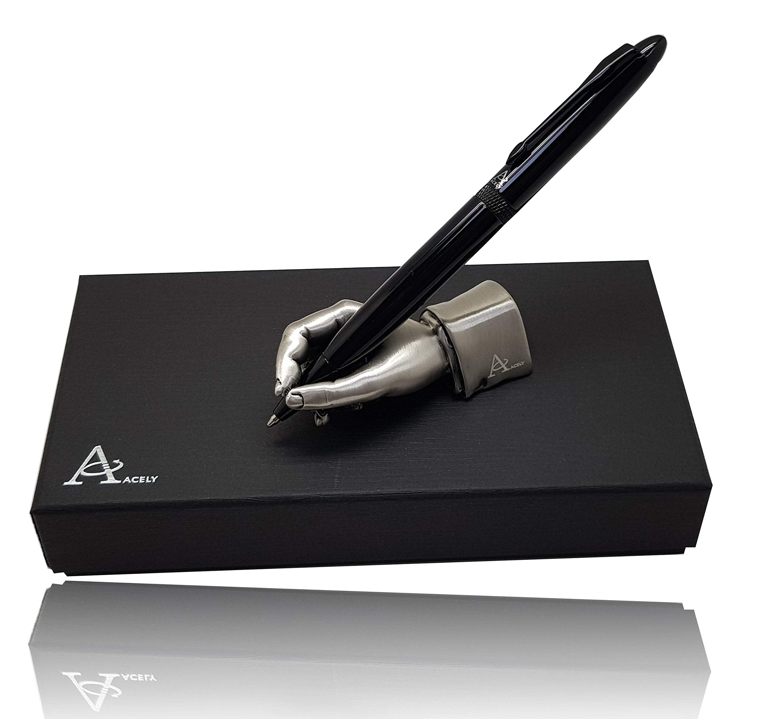 ACELY Executive glossy black Ball Point Pen with Hand Shape Pen Holder Paperweight for Desktop Organizer Pen Stand Desk Decorations for Men - Pen & holder set (Black & Anti-Silver)