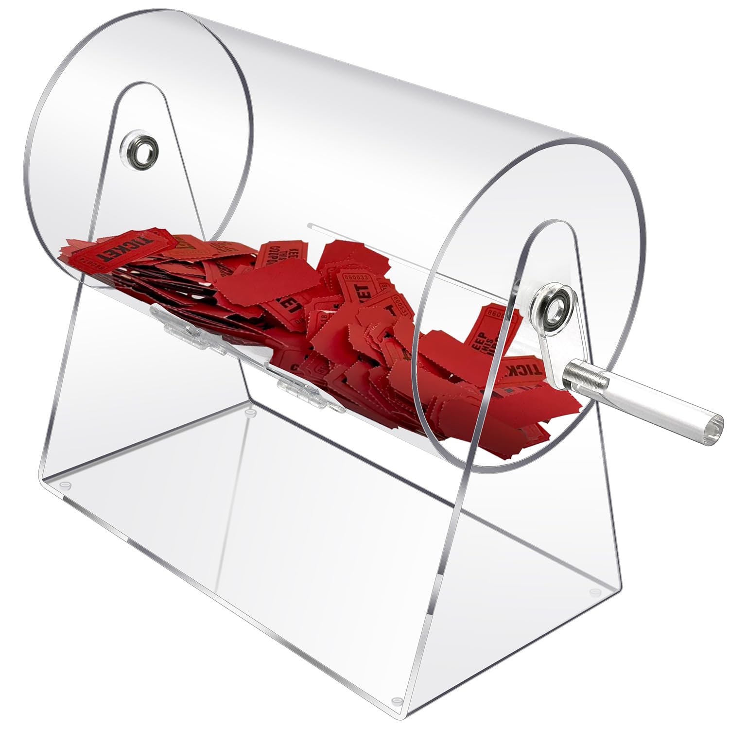 [Thicken Acrylic Raffle Ticket Drum Spinner with Handle] Designed with a sturdy acrylic handle for comfortable use; Small raffle ticket drum is made of heavy-duty clear acrylic; The acrylic raffle ticket spinning drum has a closable ticket slot, a lockable door and comes with keys, which ensure no tickets get lost or sprinkle out, offering greater security [Size Detail] Raffle ticket not included. This raffle ticket spinner is about 12.59 x 6.69 x 11 inches, the door dimensions are 5.9" L x 3.15" W; Raffle drum holds approximately 2,000 raffle tickets; Suitable for small lottery, party games [Transparent Appearance & Double Bearing Design] Acrylic Raffle drum adopts double bearing design with clear color, which ensures an open and transparent lottery process; The double bearing on both side of raffle drum provides a smooth comfortable spin every time. [Make Sure The Result ‘s Randomness and Fairness] This professional raffle spinner offers reliable and sufficient room for random mix, ensure true random results each time you use it; Acrylic design achieves fairness and openness, because the whole lottery draw process is visible, giving a sense of surprise when every result comes out. Your contestants will appreciate [Suitable for Multiple Scenarios] The acrylic raffle drum for tickets can be applied in the lottery, casino, bingo, ballot, social, corporate party, trade show, fundraiser, and so on; Draw attention and guide direct attendees to participate in your events with these stunning clear raffle drums