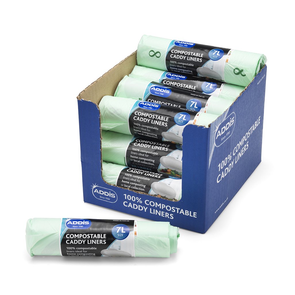 Product DescriptionProduced in the UK from starch-based renewable resources, these 100% compostable caddy liners allow food waste to be easily segregated from other household rubbish, making the tasks of waste reduction easier, safer and better for the environment. Each bag has a large 7 L capacity measuring approx. 80 cm rim x 40 cm depth (31. 5 x 16 inches). Designed to fit most compost caddy bins, ideally for use with the Addis 2. 5 L Compost food caddy bin also available in a choice of three colours. The bags conform and are printed with the compostable EN13432 logo that serves to identify and verify the composability of the product. This product and its content may be disposed of in a local authority scheme, please refer to their guidelines for the use of compostable liners and accepted waste. Approved for food waste recycling with most councils. The bags will completely biodegradable within 60 days in a commercial compost system and do not harm or contaminate the environment. Contains 12 rolls of 20 bags making a total 240 bag liners supplied. Designed for modern everyday living. ADDIS part of the home since 1780s based in the UK, we have a proud 237 year old history of design, manufacture and supply of housewares. The ADDIS brand still stands today, as it has for previous generations, for value, quality and innovation.Box Contains240 x bags