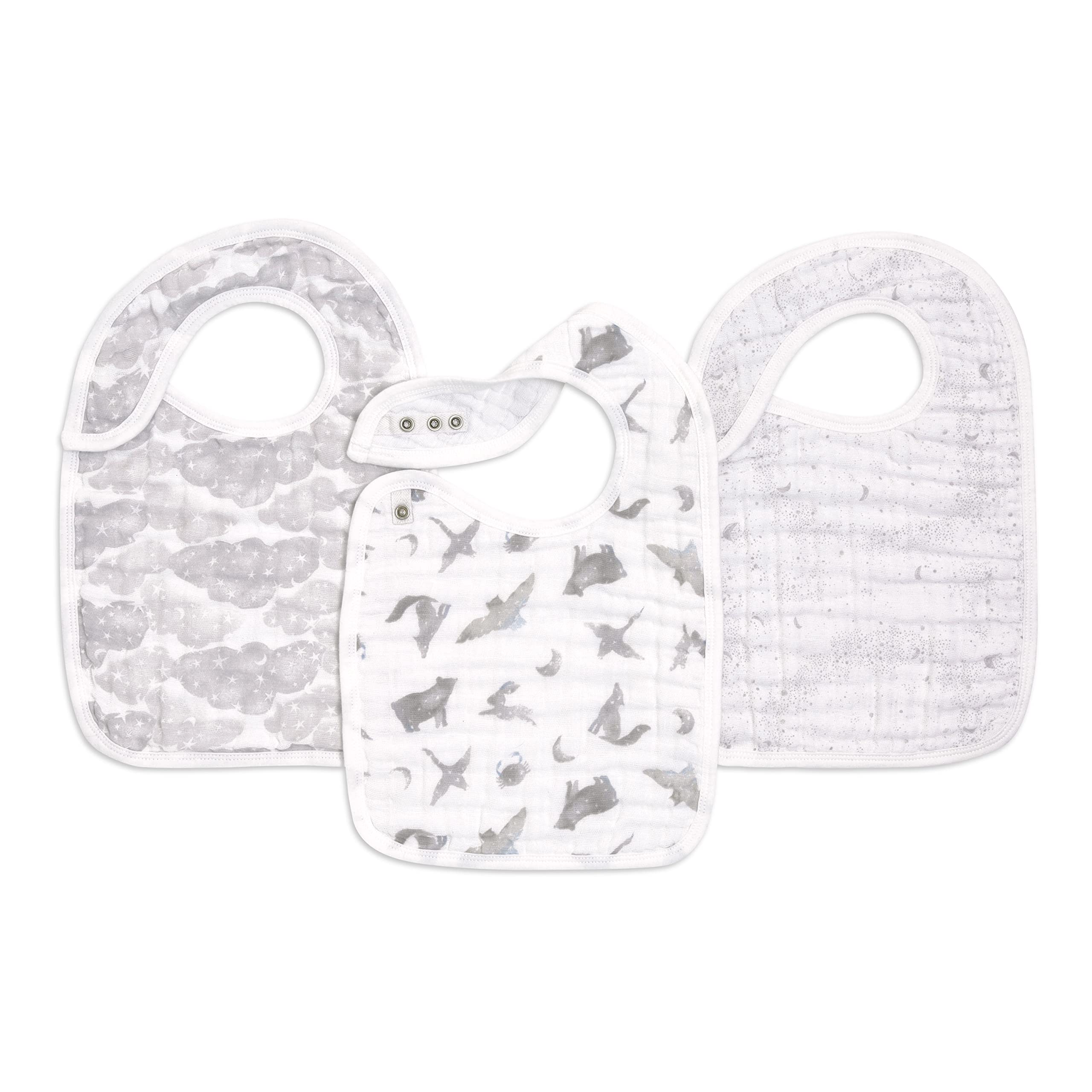 The aden + anais 100% organic cotton muslin snap baby bibs offer an adjustable fit that grows with baby thanks to three poppers conveniently located in the front for easy fastening. Made with three layers, the absorbent bib soaks up spills, drools, and baby burps. - All of aden + anais' fabrics are created free of azo chemical compounds - 100% organic cotton / 100% Card tag and plastic hook