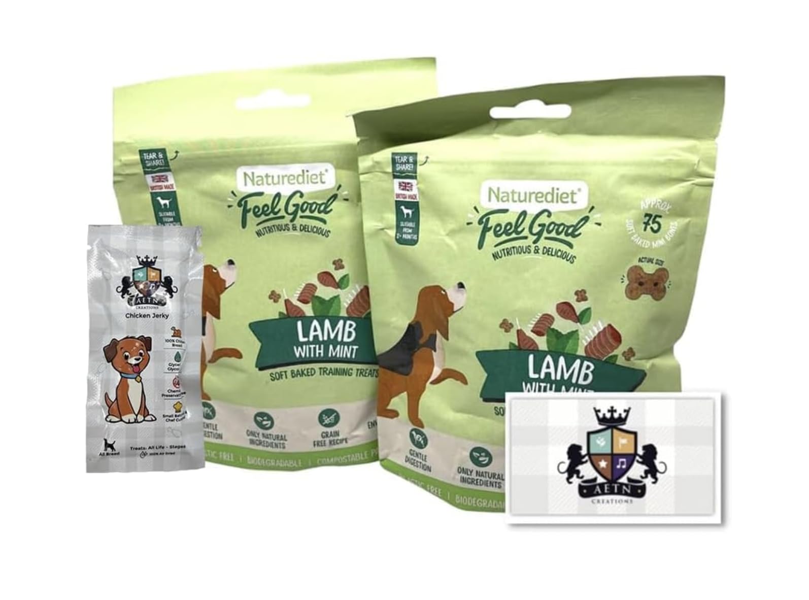 Balanced, natural treat for dogs. High-quality and complete dog snack bites contains a balanced mix of only the finest ingredients. Grain-free snacks designed to support dog training. A tasty and flavoursome treats with no artificial colours or flavours for dogs over the age of 2 months. Probiotic food and contains all the essential nutrients and vitamins your dog needs for a healthy diet. Natural, super healthy, moist and meaty, made with a wheat gluten free recipe using natures premium quality ingredient. Naturediet is perfect for cats and dogs as it has an extensive range of treat pouches (mini bites, biscuits in chicken breast, liver, salmon, duck and turkey) and food either dry or wet pouches from puppy, small, medium and large dogs to kitten, adult and senior cat. Including grain free formulas for pooch with sensitive tummies. This training dog treats pack is providing a complete and balanced food that is designed to meet the unique and different prime nutritional needs of adult dogs. This dog treat bag bundle consist of naturediet feel good soft bake training grain free treats bag of two 100g in Lamb With Mint flavour with Aetn fridge magnet. These treats are healthy and nutritious way to train your dog also in small bone shape perfect fit for dog's toy treat. With grain free recipe which means food is with no added wheat, corn, rice and other grains or artificial flavours, colours or preservatives. The best dog training treats will vary depending on your individual dog and their preferences. Some popular options include freeze-dried liver paste treats, sausages, peanut butter, milk bone, wet in gravy small pieces of cooked chicken, rabbit, antlers, salmon, duck, beef or pigs ears, turkey slices, tiny pieces or fit bites of cheese, turkey bacon, or small bits of vegetables like sweet potato from your kitchen.
