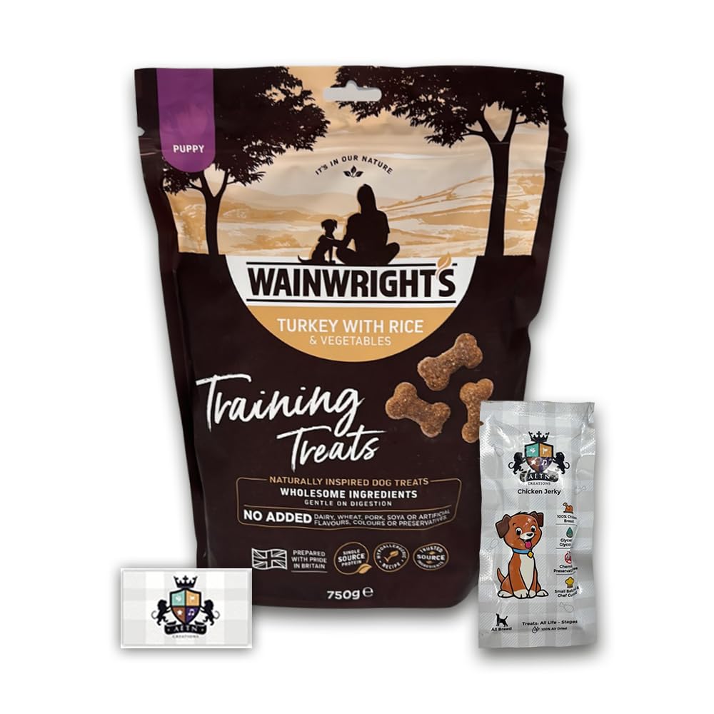Dog treats with turkey and vegetables that are irresistible tasty biscuits your puppy will love as a treat after playing with their toys or reward when training. A good quality dog treat pouch bag ideal for puppies with ingredients that are premium and balanced. Comes with an authentic AETN Creations refrigerator magnet. High-quality ingredients dog food dry which contain the natural goodness of Turkey and Sweet potato, highly digestible carbohydrate, for calm and slow release energy. The result provides all the proteins, fatty acids, carbohydrates, vitamins, and minerals in the pouch your well-beloved puppy needs. Diets that can improve your dog's breath and other gastrointestinal issues. Mineral enriched and with cranberry, rich in vitamin C and vitamin D and also helps to promote a healthy urinary tract. Dog treat bags developed especially to help with your tiny barking heads' growth and development. Full of important elemental trace naturals. Comes in bone shape dog chews for your puppy buddy, will also perfectly fit on dog toys for treats. Hypo-allergenic recipe dog training treats with no added wheat gluten, beef, pork, dairy produce, eggs, soy, or fillers and no unhealthy additives, you can be assured the highest quality natural ingredients menu have been chosen with care for your pet pooch living a full and happy life. Dog chew food recommended by vets and is reportedly tolerated very well by dogs. This treat pouch munchies for dog training is not like any other snacks because it does not use any ingredients known to commonly cause allergies in dogs such as wheat or mixed meat proteins, assuring that your pet is in good hands with wainwrights AETN Chicken Jerky Dog Treat Sample sized (5g) - 100% natural chicken breast a delicious source of protein essential for muscle growth and maintenance, low fat, nutritious and balanced snacks. A delicious wholesome snack that is free from chemicals and preservative, provides all the vitamins and minerals your dog
