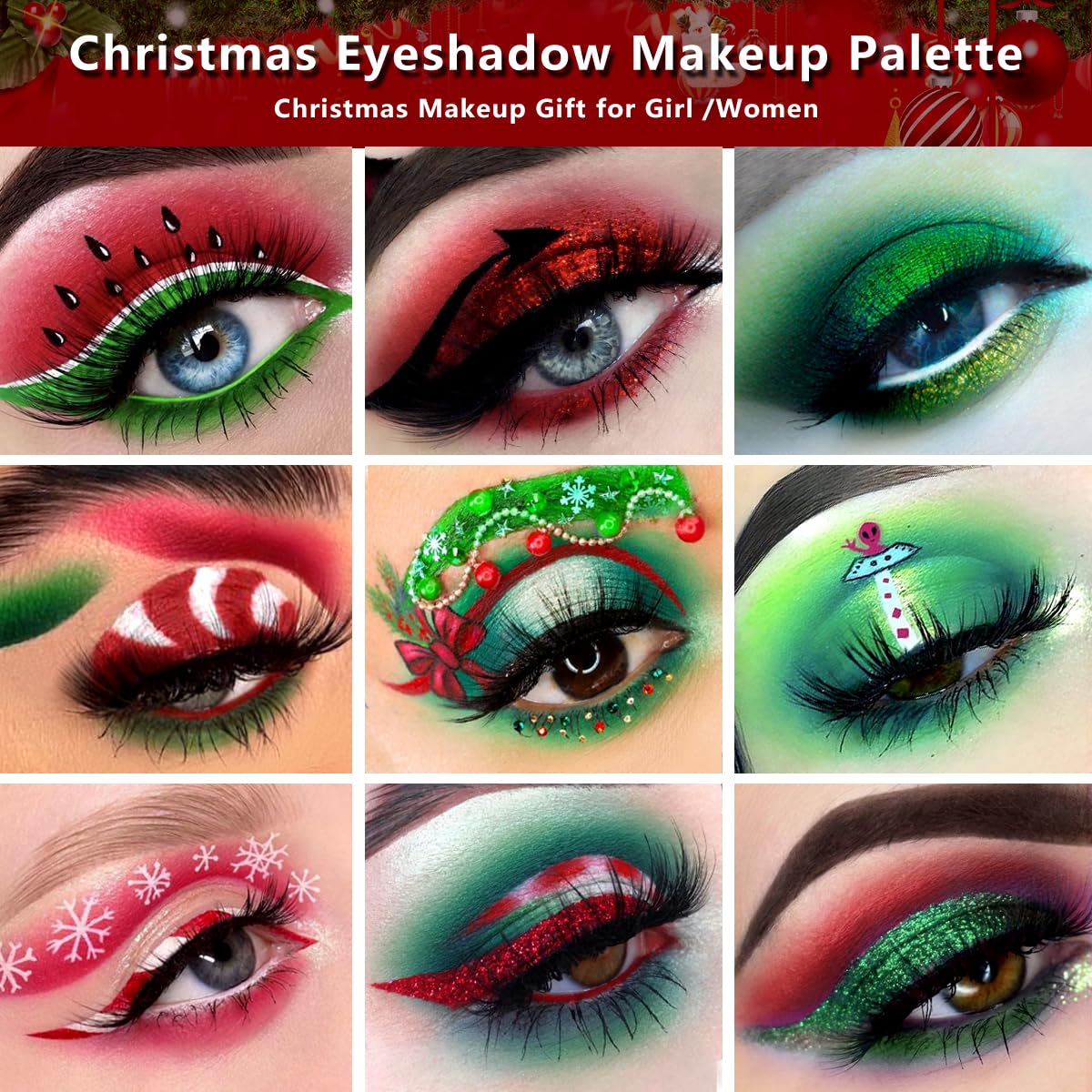 Afflano Christmas Makeup Eyeshadow Palette,Red Green Eyeshadow Pallet Highly Pigmented,Green Red Glitter Eye Shadow Makeup For Halloween Party, White Black Dark Green Blue 18 Colors Festive Gift Set