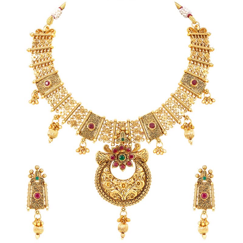 Aheli Ethnic Gold Plated Beads Stone Studded Choker Necklace with Drop Earring Wedding Fashion Traditional Jewelry Set Gift for Women