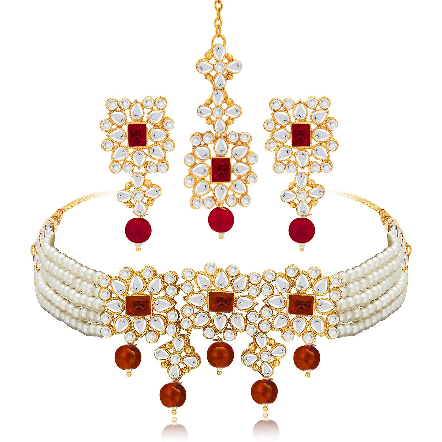 Aheli Ethnic Indian Necklace Earring Maang Tikka Set Traditional Bollywood Fashion Jewelry for Women White Maroon