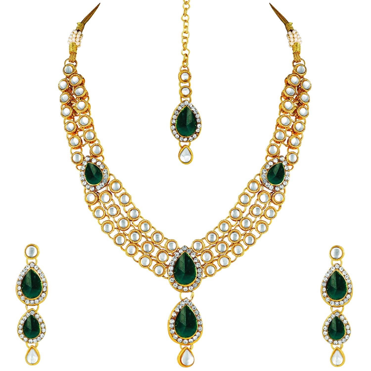 Aheli Indian Traditional Bollywood Kundan Maang Tikka Earrings Necklace Set Ethnic Jewelry for Women Girls Green