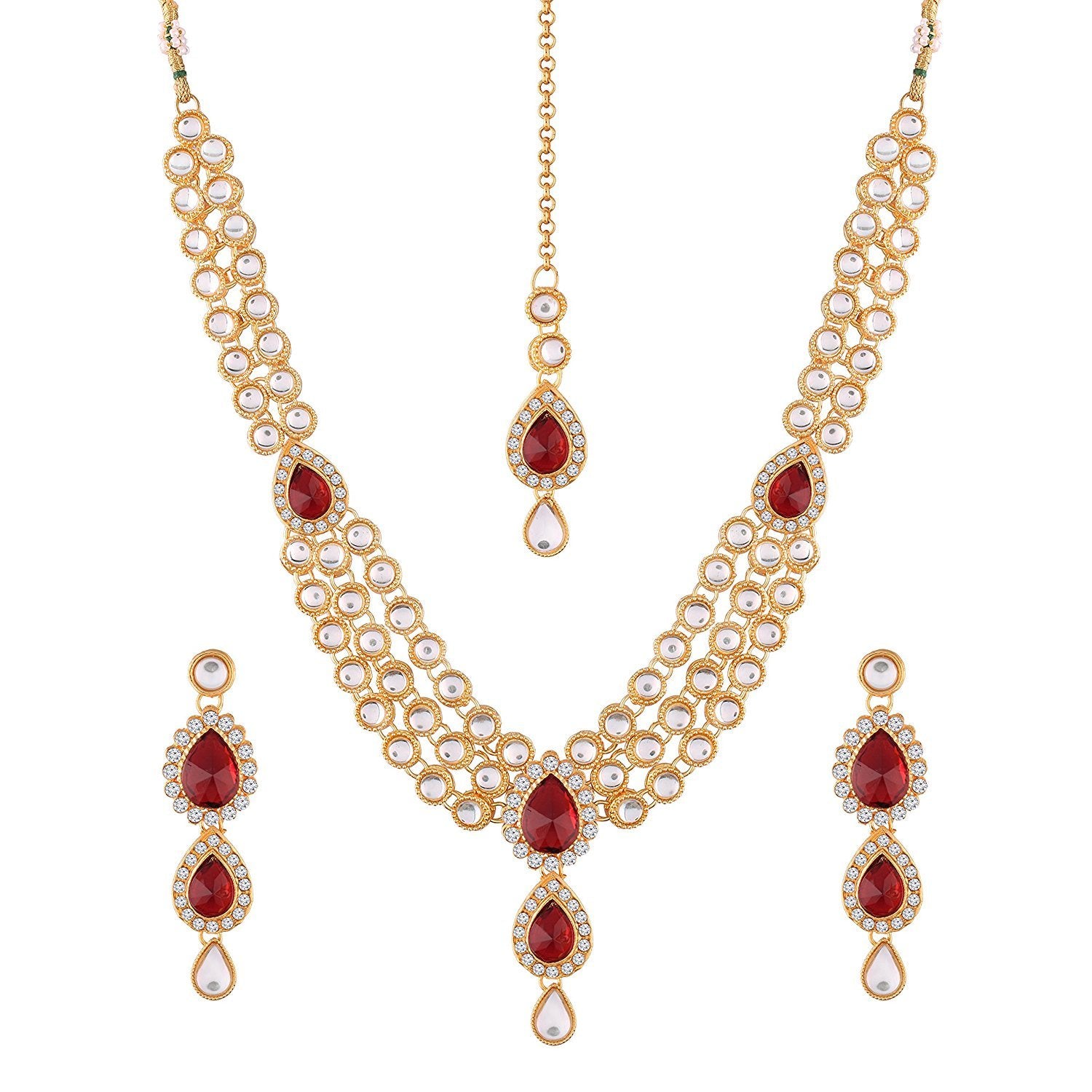 Aheli Indian Traditional Bollywood Kundan Maang Tikka Earrings Necklace Set Ethnic Jewelry for Women Girls (Green) (Red White)
