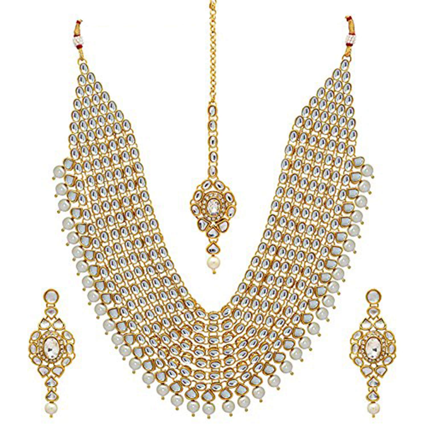 Aheli Indian Wedding Designer Faux Kundan Multi Layered Bridal Necklace Set with Maang Tikka Ethnic Fashion Jewelry for Women (White)