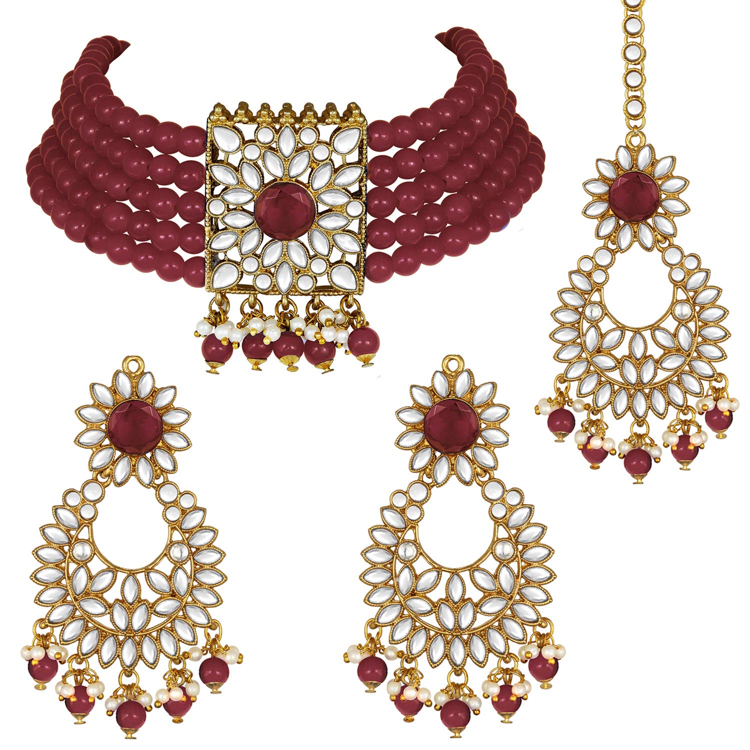 Aheli Jodha Akbar Faux Kundan Pearl Choker Necklace with Earring Maang Tikka Indian Traditional Bollywood Bridal Jewelry Set for Women Girls