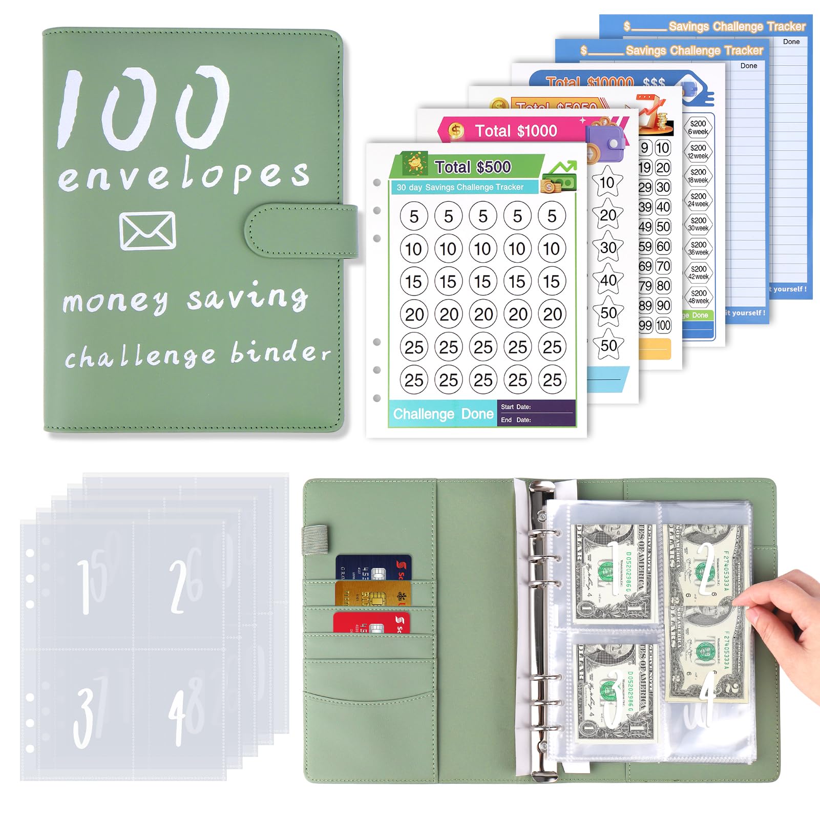 AIERSA 100 Envelopes Money Saving Challenge Binder Kit, Fun Budget Binder Book Organizer with Cash Envelopes for 30 Day, 100 Day, 52 Week Cash Stuffing, 500, 1000, 5050, 10000 Savings Challenge, Green