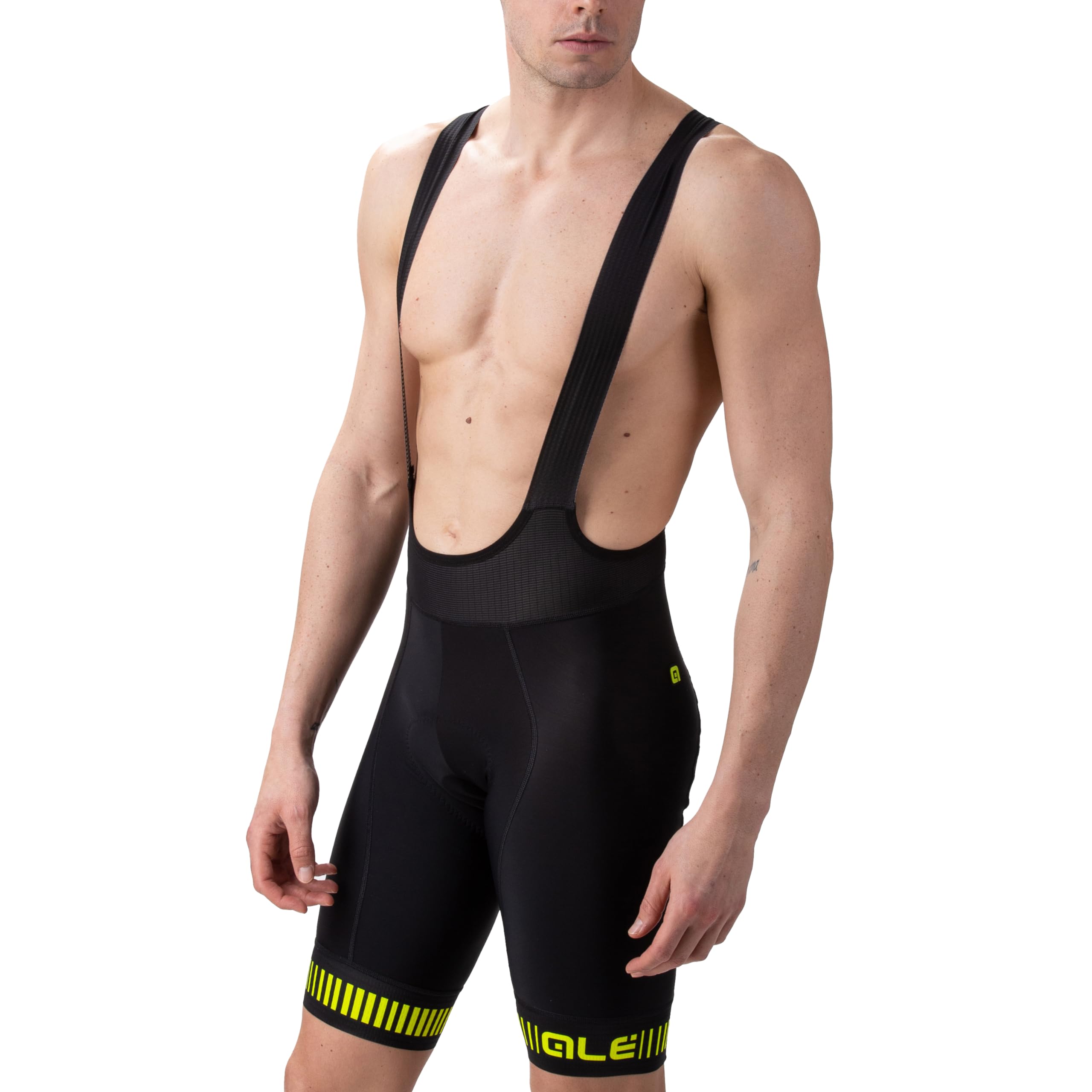 DescriptionAlé Men’s PR.R Strada Cycling Bib ShortsBuilt for comfort and performance. Crafted with a super lightweight yet hard-wearing choice of fabrics, these shorts justifiably stand out. With naturally antibacterial carbon fibres woven into the front panel, expect enhanced breathability and exceptionally quick-wicking properties.4H Chamois PadsAlé 4H Chamois made of elastic micro-fibre with padding strategically positioned in the contact points. In the perineal and ischiatic area, the 90 kg/m³ density padding is calibrated and breathable on all covered points to ensure utmost protection against shocks and stresses of the road.Fit and Collection: PR.RTested and designed in collaboration with World Tour level athletes, PR.R offers range-topping performance and aerodynamics, with a focus on lightness, speed and the latest fabric innovations. With its Body Mapping technology and anatomic construction, PR.R fits like a second skin.FeaturesDesigned for elite cyclists with range-topping performance for aerodynamics and a focus for lightness and speed Ale Body Mapping technology combines specific fabrics with anatomic study to ensure performance and perfect fit Patented fabric which creates grooves to promote airflow and ventilation Am carbon fibre which provides antistatic action and accelerates the evaporation of sweat Leg stability system that keeps the perfect level of compression without constriction because of the silicone threads interwoven through the fabric Leg comfort system placed in the back of the bib short to improve fitting which suits all body types and reduces compression while riding Reflective details around the leg and back so you can be seen whatever the weather and time of day 4H seat pad with density padding which is calibrated and breathable on all covered points to ensure protection against shocks and stresses on the roadDetails and Materials:Breathability: 5/5 Lightness: 5/5 UV Protection: 4/5 Recommended temperature: 18°/30°C Weight: 165 grams Fabrics: Zaffiro, AM Carbon Fiber, Air Cel Fabric composition: Main Fabric: 78% Polyamide, 22% Elastane | Back Insert/Leg Insert: 79% Polyamide, 21% Elastane | Waist Insert: 62% Polyamide, 36% Elastane, 2% Other Fibers | Braces/Leg Band: 54% Polyester, 46% ElastaneCare Instructions:Washing machine at 30°C Do not use bleach Do not dry clean/ iron/ tumble dry Wash similar colours together