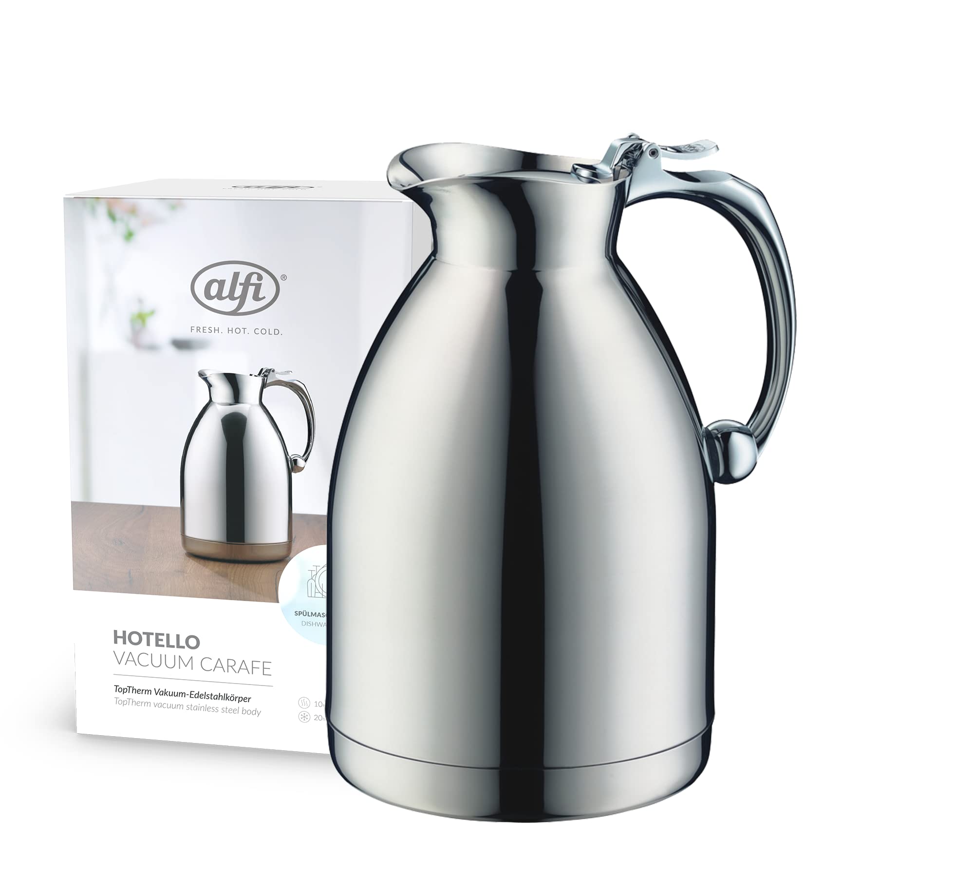 Alfi vacuum carafe Hotello: the robust all stainless steel vacuum carafe for hotels and restaurants. Absolutely dishwasher safe and available in 4 sizes. Premium quality. , Best insulating efficiency , Dishwasher Proof , Keeps 12 hours hot or 24 hours cold , Break-resistant , High quality stainless steel, polished , Practical one-hand operation , Ergonomical metal handle, chrome plated , Unbreakable Toptherm vacuum insulated liner , Absolutely hygienic - no corners, edges and niches , Hygiene certificate available , Capacity: 1 Liter / 8 Cups , Lenght: 13,2 cm , Width: 13,2 cm , Height: 22,0 cm , Alfi item number: 557000100 , Pack contains:1 Alfi vacuum carafe Hotello, Thermal carafe for Hotel and gastronomy, Coffee Pot, Stainless steel, Polished, 1 Liter, 557000100