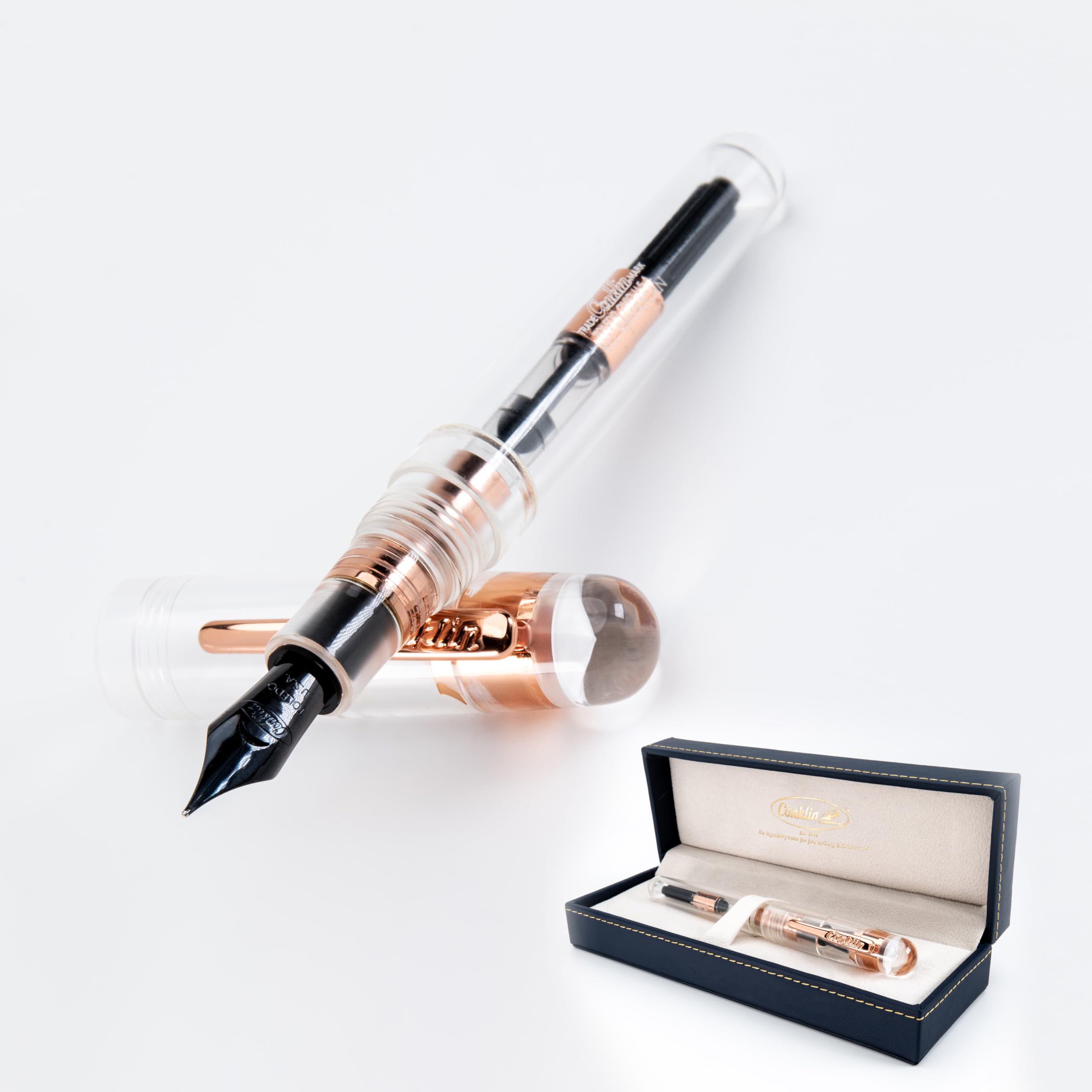 The Conklin All American Demo/Rosegold Limited Edition Fountain Pen with a Stub nib is a striking combination of bold design and refined craftsmanship. Established in 1898, Conklin has been at the forefront of the luxury pen industry, known for creating writing instruments that are both innovative and timeless. This limited edition pen features a transparent resin body paired with 18 Karat rose gold plated accents, offering a stunning visual contrast. The Stub nib, crafted by JoWo in Germany, provides broad, expressive strokes, perfect for calligraphy and artistic writing. The pen’s eyedropper filling system ensures a larger ink capacity, ideal for extended writing sessions. Packaged in a luxurious gift box, this pen is a perfect gift for professionals, collectors, and pen enthusiasts who value both style and substance.
