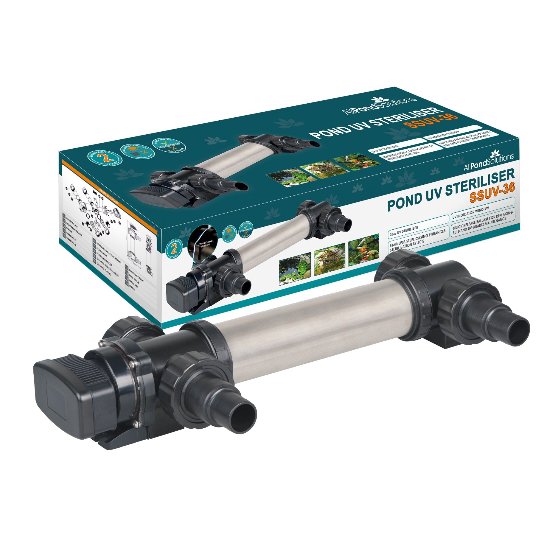 DescriptionProduct DescriptionThe All Pond Solutions SSUV UV clarifiers utilise an efficient stainless steel build that is up to 30% more effective than comparable plastic products and its reflective body increases effectiveness of UVC clarification by 50% or more. This new stainless steel design is extra tough and durable to make for long lasting use and crystal clear pond water.With many improvements over other models, the SSUV stainless steel pond steriliser has a built in advanced thermal protection feature, which automatically shuts the unit down if in danger of overheating. Once the unit has cooled down to normal temperature it will restart and continue to operate.Designed for large ponds the SSUV includes a one in / one out system for water delivery and exit. Included, is an array of attachments to fit either flexible hose or BSP pipe fittings. The UV clarifier also has a transparent panel enabling you the to check that the UV is fully operational at all times.Features:Improved stainless steel designQuartz attachment on the end lights up when operationalTwo stepped hosetails supplied for flexible hoseFour pipe attachments supplied for BSP pipeSurface mounting brackets includedAdvanced thermal heat protection built-inEasy clip-release for bulb / quartz glass maintenanceInstruction manual in English, French, German, and Spanish.FREE 2 year warranty- Hosetails to fit: 1.5, 1.75, 2 / 38mm, 44mm, 51mm - 5m power cable - Watt: 36w - Voltage: 220-240V - Free 24 Months WarrantyBox ContainsPond UV