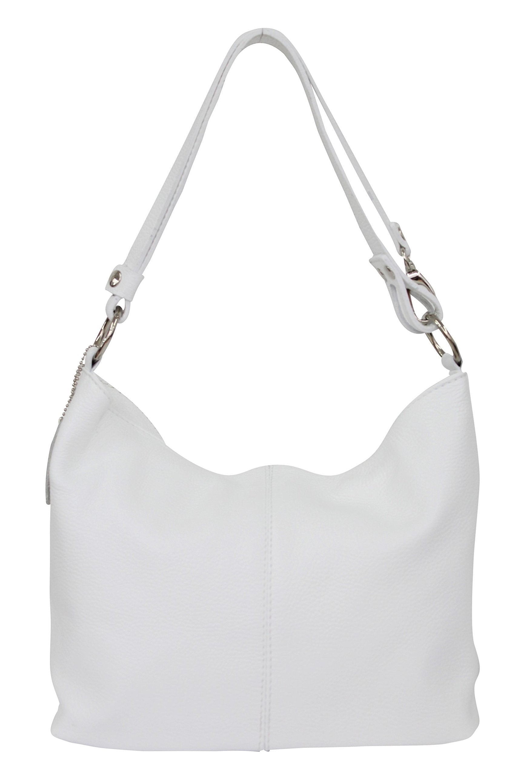 Women's shoulder bag/cross-body bag made from soft grained cowhide leather, handmade in Italy. Main compartment with zip, 1 zip pocket in the middle. 1 inside side pocket with zip. 1 outside pocket with zip. Shoulder strap has a double use with a connection at approx. 95 cm. Bag dimensions: approx. 28 cm x 24 cm x 14 cm (L x H x W). Weight: approx. 500 g
