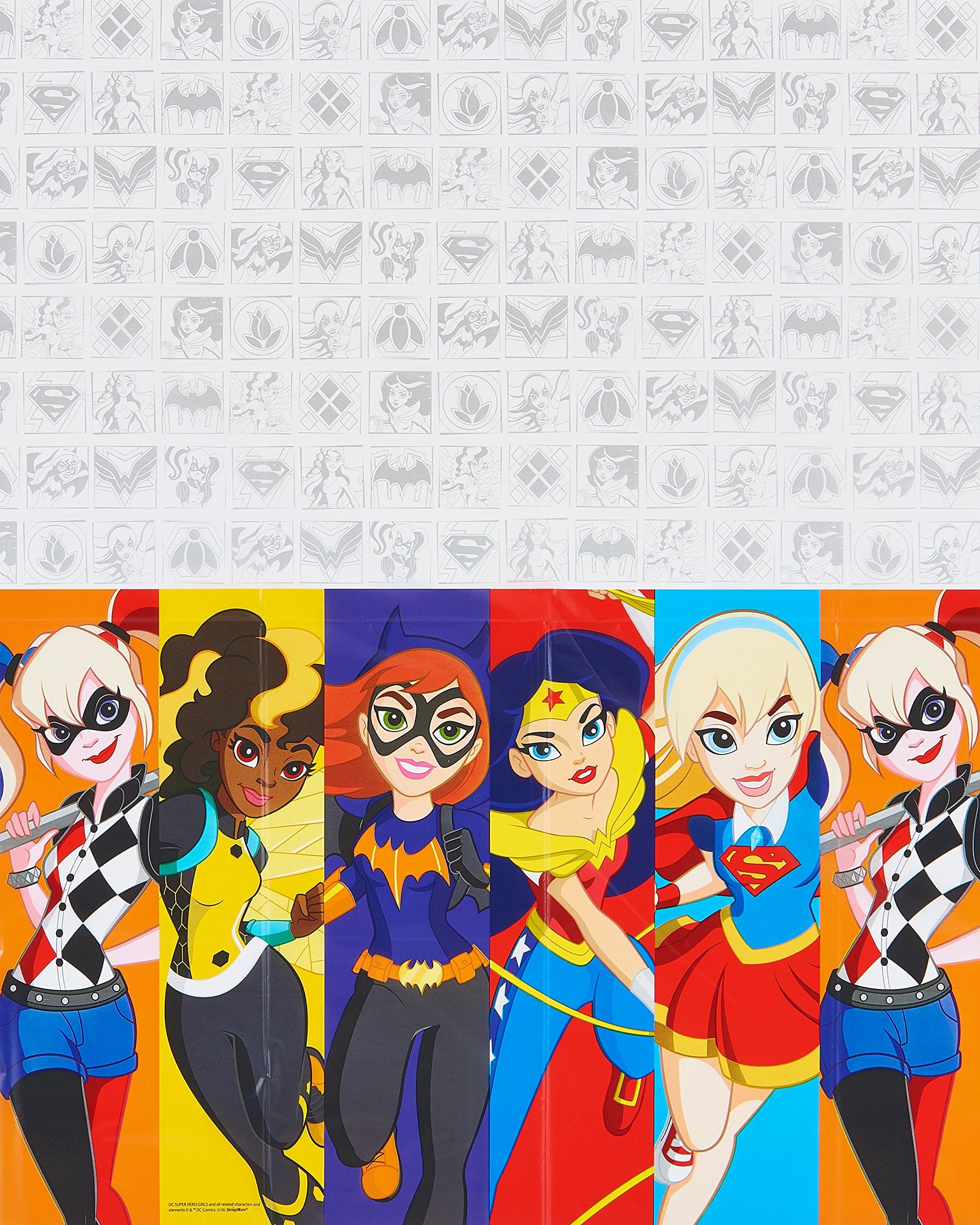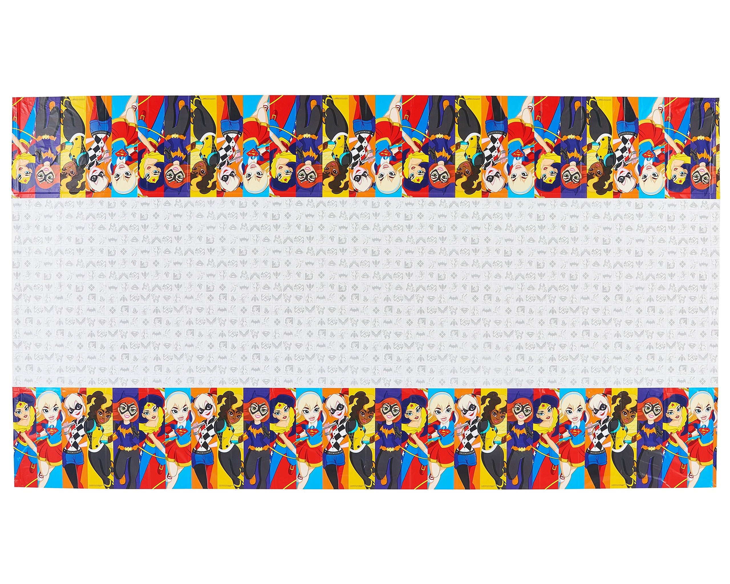 Your superhero superfan will love this DC Super Hero Girls table cover featuring Wonder Woman, Supergirl, Batgirl, Harley Quinn and Bumblebee! Each disposable plastic table cover measures 54 in. x 96 in. and provides both decoration and furniture protection. You'll love the quick and easy cleanup! The colorful table cover fits most tables and will pack a punch when coordinated with other Super Hero Girls-themed birthday party supplies!.