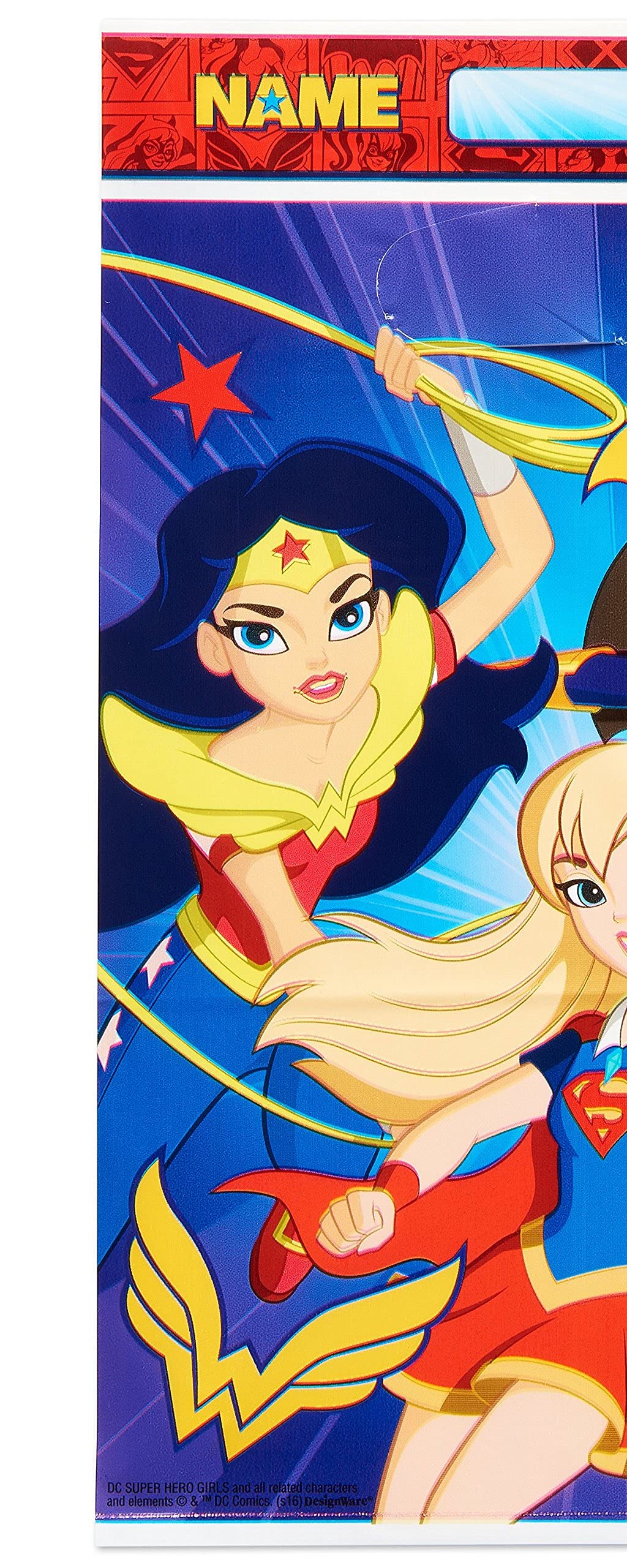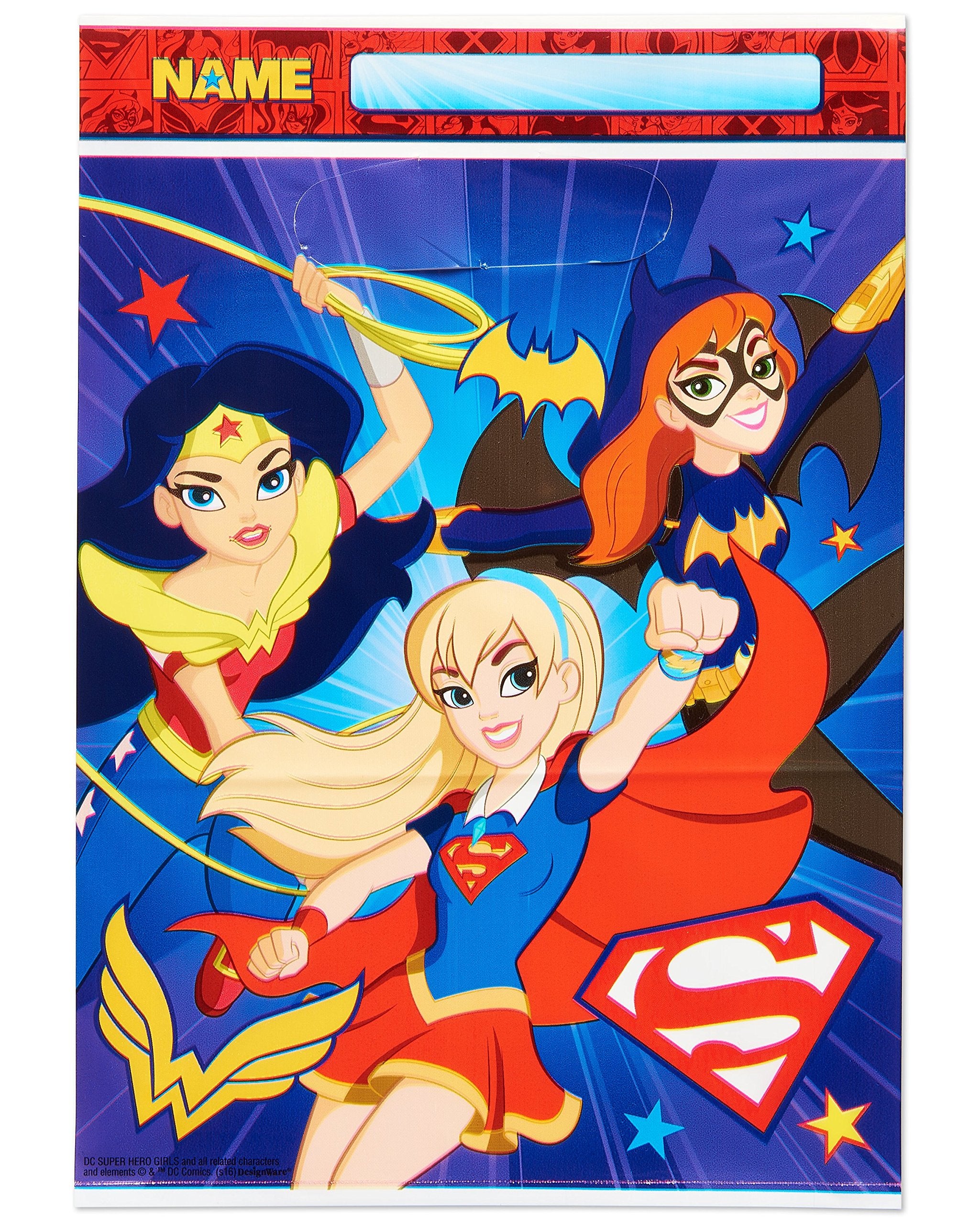 Make sure every little superhero leaves your child's DC Super Hero Girls party with a super-cool treat bag featuring Wonder Woman, Supergirl and Batgirl in action-packed poses! Each bag measures 6-1/2 in. x 9-1/4 in. and has a cutout handle and a space to write the recipient's name. Fill with party favors and other small surprises for a quick and easy way to treat every guest at your child's Super Hero Girls or superhero-themed birthday party!.