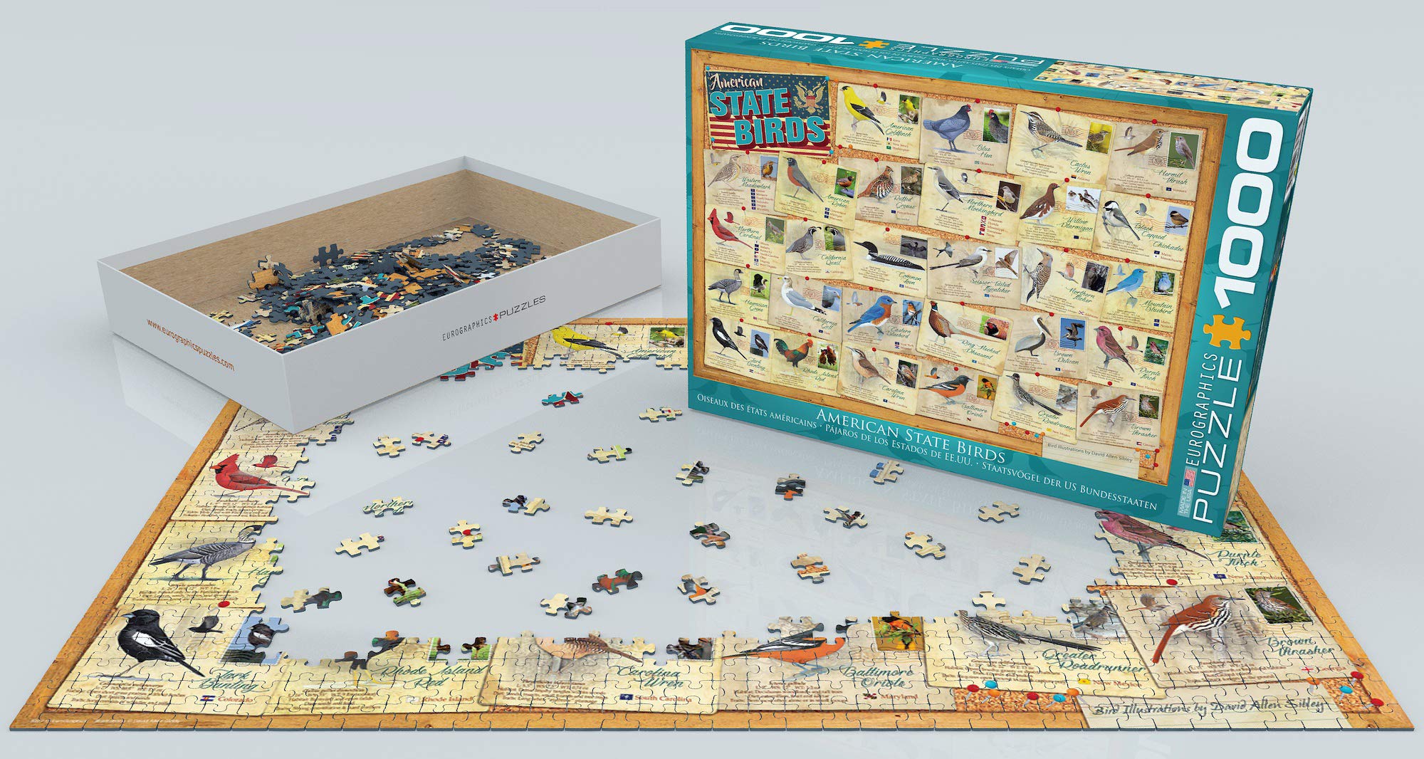 1000-piece puzzle; Box size: 10 x 14 x 2.37. Finished Puzzle Size: 19.25 x 26.5. Strong high-quality puzzle pieces. Made from recycled board and printed with vegetable based ink. This illustration provides an accurate review of the state bird for the entire US.