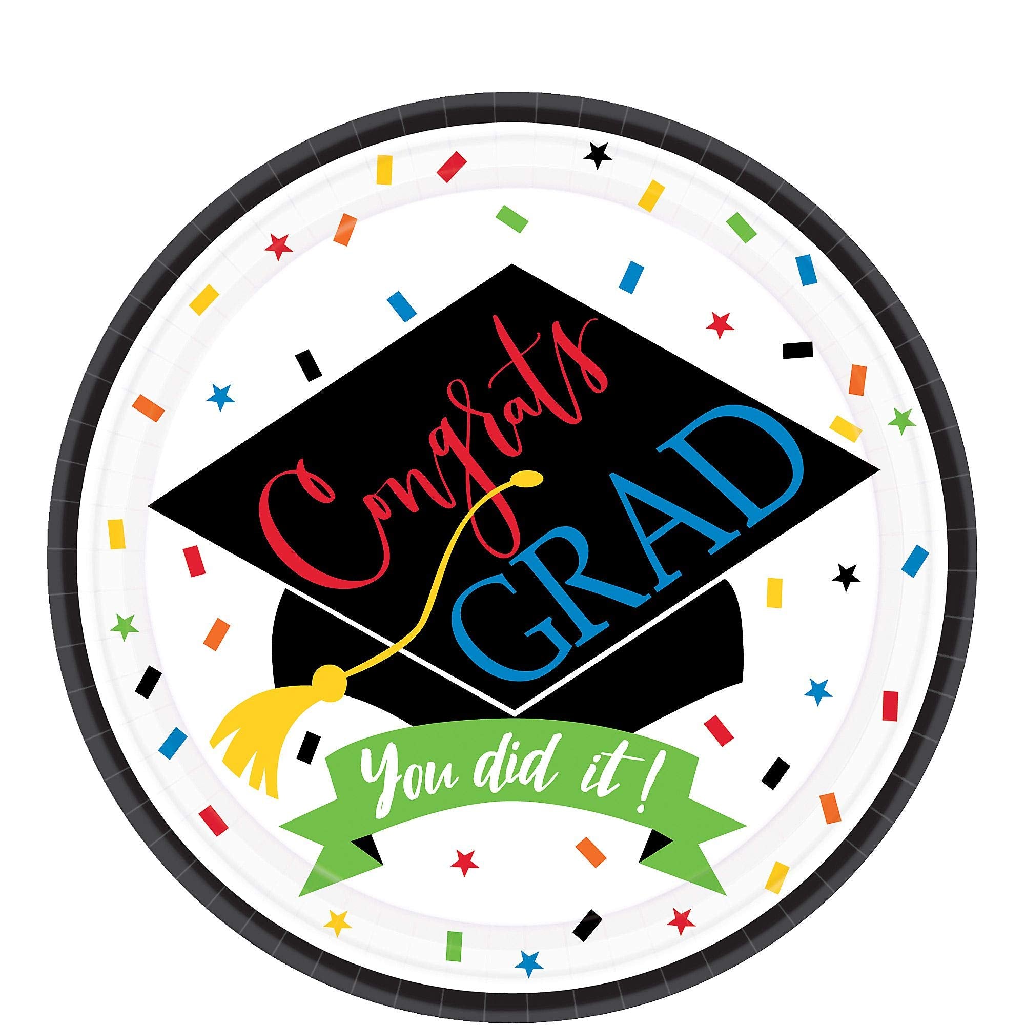Congratulations graduate! You've finished one part of your life and now you're on to the next. Celebrate your achievement with a big bash and serve up some of your favorite foods on these large plates decorated with a graduation cap, a "Congrats Grad you did it! " Message, and is littered with confetti.