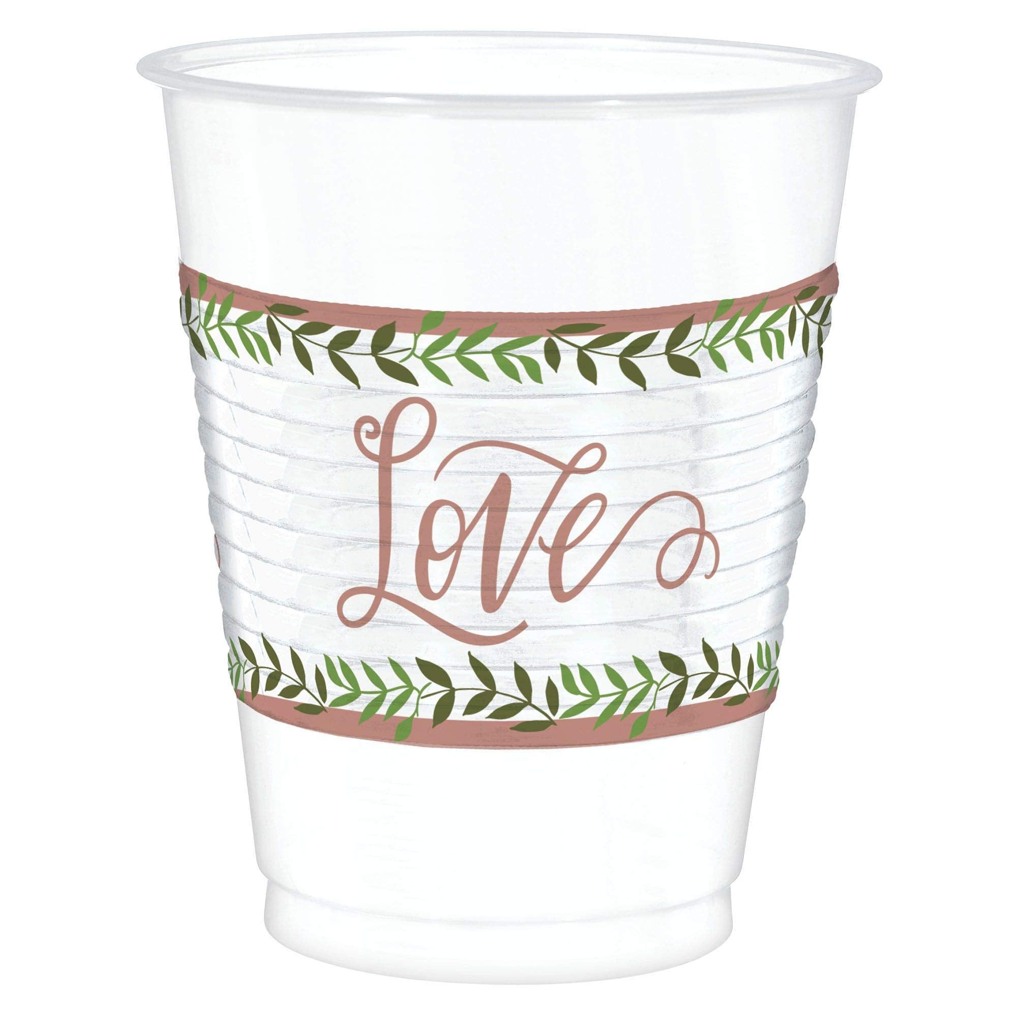 You won't be-leaf who is finally getting married! Have a tastefully elegant get-together when you set your table with this Love and Leaves Bridal Shower Plastic Cups. Each white plastic cup features metallic bands decorated with leafy vines and a cute "love" headline. Use these cups to hold the couple's favorite cold drinks and toast their new beginning. Perfect for engagement parties and bridal showers.